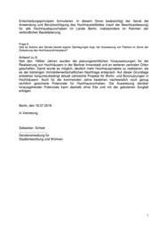 Entscheidungsprinzipien formulieren. In diesem Sinne beabsichtigt der Senat die Anwendung und Berücksichtigung des Hochhausleitbildes (nach der Beschlussfassung) für alle Hochhausbauvorhaben im Lande Berlin, insbesondere im Rahmen der verbindlichen Bauleitplanung. Frage 6: Gibt es Seitens des Senats bereits eigene Überlegungen bzgl. der Ausweisung von Flächen im Sinne der Zielsetzung des Hochhausrahmenplans? Antwort zu 6: Seit den 1990er Jahren wurden die planungsrechtlichen Voraussetzungen für die Realisierung von Hochhäusern in der Berliner Innenstadt und an weiteren zentralen Orten geschaffen. Damit wurde es möglich, deutlich mehr Hochhausprojekte zu realisieren, als es der bisherigen immobilienwirtschaftlichen Nachfrage entsprach. Auf dieser Grundlage entstehen konjunkturbedingt aktuell zahlreiche Projekte für Wohn- und Büronutzungen in Hochhäusern. Auch für die kommenden Jahre bestehen nachweislich noch genug rechtlich gesicherte Potenziale für Hochhausvorhaben. Die Ausweisung darüber hinausgehender Potenziale kann deshalb ohne Eile und mit der gebotenen Sorgfalt erfolgen. Berlin, den 18.07.2018 In Vertretung Sebastian Scheel ................................ Senatsverwaltung für Stadtentwicklung und Wohnen 3
