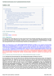 Verfahrenshinweise der Ausländerbehörde Berlin VAB A 32 Inhaltsverzeichnis A.32. Kindernachzug ................................................................................................................................ 288 Änderungsdatum ............................................................................................................................... 614 32.0.1. Allgemeines ........................................................................................................................... 288 32.0.2. Nachweis der Personensorge bzw. Vaterschaftsanerkennungen im Inland ......................... 288 Sorgerechtsübertragung durch ausländische Gerichtsentscheidung ......................................... 289 Aufenthaltsrecht eines Elternteils nach § 28 Abs. 1 S. 1 Nr. 1 oder Nr. 3 ................................. 289 Maßgeblicher Zeitpunkt für Feststellung der Minderjährigkeit .................................................... 290 Aufnahme eines Kindes zu Adoptionsbewerbern ....................................................................... 290 32.1.0. Grundsätzliche Anmerkungen ............................................................................................. 291 Kindernachzug unter 16 Jahren ................................................................................................. 291 32.1.3. Kindernachzug zu Eltern mit einem Aufenthaltsrecht nach §§ 36, 36a .......................... 292 32.2. Sprachkenntnisse .................................................................................................................... 292 32.3. KIndernachzug bei gemeinsamen Sorgerecht und einem im Ausland aufhältlichen Elternteil ...... 292 32.4. Kindernachzug im Ermessen .................................................................................................... 293 32.5. mobile Forscher begleitende minderjährige ledige Kinder ....................................................... 293 A.32. Kindernachzug Änderungsdatum ( 31.07.2018, FzNeuG; 13.09.2018 ) 32.0.1. Allgemeines Der Nachzug setzt in allen Fällen des § 32 voraus, dass das Kind nicht verheiratet, geschieden oder verwitwet ist und das 18. Lebensjahr noch nicht vollendet hat (vgl. § 80 Absatz 3 Satz 1; hiervon abweichende Volljährigkeitsgrenzen nach dem Recht der Herkunftsstaaten sind unerheblich). Darüber hinaus kommt ein Kindernachzug nur nach § 36 Absatz 2 in Fällen einer außergewöhnlichen Härte im Ermessenswege in Betracht (zur Geltungsdauer vgl. A.7.2.3.1.). Merke: Der Kindernachzug zu einem alleinsorgeberechtigten Elternteil oder Eltern, die als subsidiär Schutzberechtigte Inhaber einer Aufenthaltserlaubnis nach § 25 Abs. 2 S. 1 2. Alt. sind, richtet sich seit Inkrafttreten des Gesetzes zur Neuregelung des Familiennachzugs zu subsidiär Schutzberechtigten grundsätzlich nach § 36a (zu den Ausnahmen s. A.36a.). Der Kindernachzug richtet sich allerdings weiterhin nach § 32, sofern ein personensorgeberechtigter Elternteil einen der in § 32 Abs. 1 aufgeführten Aufenthaltstitel besitzt, während der andere sorgeberechtigte Elternteil im Besitz einer Aufenthaltserlaubnis nach § 25 Abs. 2 S. 1 2. Alt. ist. In den Fällen, in denen das (Geschwister-) Kind zeitgleich mit beiden Eltern oder einem allein personensorgeberechtigten Elternteil zu einem minderjährigen unbegleiteten Ausländer nachzieht, der als Asylberechtigter, Flüchtling oder subsidiär Schutzberechtigter anerkannt ist, beachte die Ausführungen unter A.32.1.3. 32.0. 2. Nachweis der Personensorge bzw. Vaterschaftsanerkennungen im Inland Für den Nachweis der Personensorge bzw. Vaterschaftsanerkennungen im Inland gilt folgendes: Bei nicht-ehelichen Kindern kann die Vaterschaft durch öffentliche Beurkundung sowohl durch den Notar, das Amtsgericht, den Standesbeamten, das Jugendamt als auch durch das Gericht, bei dem die Vaterschaftsanerkennung anhängig ist, erfolgen (so § 1597 Abs. 1 BGB, der jede öffentliche Beurkundung genügen lässt). Zwar ist die Vaterschaft mit der öffentlichen Beurkundung gültig, ohne dass es auf die Beischreibung im Geburtenbuch durch den Standesbeamten ankommt (§ 1597 Abs. 2 BGB hat keinen Einfluss auf die Gültigkeit), grundsätzlich ist aber zum Nachweis der Vaterschaft die Beischreibung abzuwarten und die Vorlage einer entsprechenden Geburtsurkunde, aus der der Vater des Kindes hervorgeht, zu verlangen . Ausreichend ist auch ein Auszug aus dem Geburtenregister, der die Vaterschaft belegt, soweit die dort verzeichneten Personalien mit den nachgewiesenen Personalien übereinstimmen. Dies deshalb, weil eine Anerkennung erst dann wirksam wird, wenn auch die Mutter des Kindes oder - wenn dieser die elterliche Sorge insoweit nicht zusteht - auch das Kind der Anerkennung zugestimmt haben (vgl. § 1595 BGB). Außerdem ist die Anerkennung nur wirksam, wenn nicht die Vaterschaft eines anderen Mannes besteht (§ 1594 BGB) und kann – etwa bei Dieses PDF wurde erstellt am: 16.08.2019 Seite 288 von 815