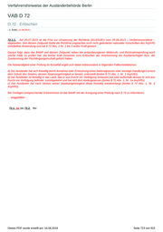 Verfahrenshinweise der Ausländerbehörde Berlin VAB D 72 D.72. Erlöschen ( 2. ÄndG; 21.08.2015 ) 72.1.1. Am 20.07.2015 ist die Frist zur Umsetzung der Richtlinie 2013/32/EU vom 26.06.2013 – Verfahrensrichtlinie – abgelaufen. Seit diesem Zeitpunkt findet die Richtlinie ungeachtet noch nicht geänderter nationaler Vorschriften des AsylVfG unmittelbar Anwendung und hat § 72 Abs. 1 Nr. 1 bis 2 außer Kraft gesetzt. Daraus folgt, dass das BAMF seit diesem Zeitpunkt neben der anlassbezogenen Widerrufs- und Rücknahmeprüfung auch solche Fälle zu prüfen hat, die bisher kraft Gesetzes zum Erlöschen der Anerkennung als Asylberechtigter bzw. der Zuerkennung der Flüchtlingseigenschaft geführt haben. Die Notwendigkeit einer Prüfung im Einzelfall ergibt sich dabei insbesondere in folgenden Fallkonstellationen: a) Der Ausländer hat sich freiwillig durch Annahme oder Erneuerung eines Nationalpasses oder sonstige Handlungen erneut dem Schutz des Staates, dessen Staatsangehörigkeit er besitzt, unterstellt (bisher § 72 Abs. 1, Nr. 1 AsylVfG). b) Der Ausländer ist freiwillig in das Land, das er aus Furcht vor Verfolgung verlassen hat oder außerhalb dessen er sich aus Furcht vor Verfolgung befindet, zurückgekehrt und hat sich dort niedergelassen (bisher § 72 Abs. 1, Nr. 1a AsylVfG). c) Der Ausländer hat nach Verlust seiner Staatsangehörigkeit diese freiwillig wiedererlangt (bisher § 72 Abs. 1, Nr. 2 AsylVfG). Bei Vorliegen entsprechender Erkenntnisse ist das BAMF mit der Anregung einer Prüfung nach § 73 zu informieren. ... weggefallen ... 72.1. 1a. bis 72.2. frei Dieses PDF wurde erstellt am: 16.08.2019 Seite 723 von 815
