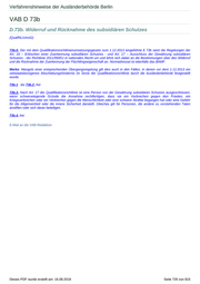 Verfahrenshinweise der Ausländerbehörde Berlin VAB D 73b D.73b. Widerruf und Rücknahme des subsidiären Schutzes (QualRiLiUmsG) 73b.0. Der mit dem Qualifikationsrichtlinienumsetzungsgesetz zum 1.12.2013 eingeführte § 73b setzt die Regelungen der Art. 16 – Erlöschen einer Zuerkennung subsidiären Schutzes - und Art. 17 – Ausschluss der Gewährung subsidiären Schutzes - der Richtlinie 2011/95/EU in nationales Recht um und lehnt sich dabei an die Bestimmungen über den Widerruf und die Rücknahme der Zuerkennung der Flüchtlingseigenschaft an. Normadressat ist ebenfalls das BAMF. Merke: Mangels einer entsprechenden Übergangsregelung gilt dies auch in den Fällen, in denen vor dem 1.12.2013 ein zielstaatsbezogenes Abschiebungshindernis im Sinne der Qualifikationsrichtlinie durch die Ausländerbehörde festgestellt wurde. 73b.1 . bis 73b.2. frei 73b.3. Nach Art. 17 der Qualifikationsrichtlinie ist eine Person von der Gewährung subsidiären Schutzes ausgeschlossen, wenn schwerwiegende Gründe die Annahme rechtfertigen, dass sie ein Verbrechen gegen den Frieden, ein Kriegsverbrechen oder ein Verbrechen gegen die Menschlichkeit oder eine schwere Straftat begangen hat oder eine Gefahr für die Allgemeinheit oder die innere Sicherheit darstellt. Gleiches gilt für Personen, die andere zu vorstehenden Taten anstiften oder sich daran beteiligen. 73b.4. frei E-Mail an die VAB-Redaktion Dieses PDF wurde erstellt am: 16.08.2019 Seite 726 von 815