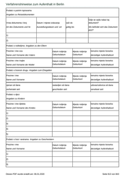 Verfahrenshinweise zum Aufenthalt in Berlin Ime majke Name der Mutter __________________________________________________ Zadnja adreas u domovini (ulica, kucni broj, mjesto) Letzte Anschrift im Heimatstaat /Straße, Hausnummer, Ort) _________________________________________________ _________________________________________________ _________________________________________________ Datum:________________________ Potpis: _________________________________ Unterschrift Anlage 2 Osobni list / Personalbogen Prezime Name Ime Vorname Datum rodjenja Geburtsdatum Mjesto rodjenja Geburtsort Narodnost Volkszugehörigkeit Vjeroispovjest Religionszugehörigkeit Državljanstvo Staatsangehörigkeit(en) Posljednja adresa u domovini (mjesto, ulica, broj) letzte Anschrift im Heimatstaat (Wohnort, Straße, Hausnr.) Dieses PDF wurde erstellt am: 06.01.2020 ... Seite 812 von 843