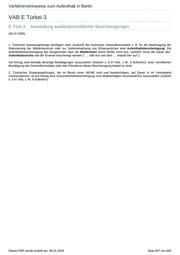 Verfahrenshinweise zum Aufenthalt in Berlin VAB E Türkei 3 E.Türk.3. Ausstellung ausländerrechtlicher Bescheinigungen (20.07.2005) 1. Türkische Staatsangehörige benötigen nach Auskunft des türkischen Generalkonsulates z. B. für die Beantragung der Reduzierung der Militärdienstzeit oder zur Geltendmachung von Erbansprüchen eine Aufenthaltsbescheinigung. Die Aufenthaltsbescheinigung des Bürgeramtes über die Meldezeiten reicht hierfür nicht aus, vielmehr muss die Dauer des Aufenthaltsrechts seit der Einreise bescheinigt werden (“ .... hält sich seit dem .... erlaubt hier auf.”). Auf Antrag sind deshalb derartige Bestätigungen auszustellen (Gebühr s. § 47 Abs. 1 Nr. 9 AufenthV); einer schriftlichen Bestätigung des Generalkonsulates über das Erfordernis dieser Bescheinigung bedarf es nicht. 2. Türkischen Staatsangehörigen, die im Besitz einer AE/NE sind und beabsichtigen, auf Dauer in ihr Heimatland zurückzukehren, ist auf Antrag eine Grenzübertrittsbescheinigung zum beabsichtigten Ausreisetermin auszustellen (Gebühr s. § 47 Abs. 1 Nr. 9 AufenthV). Dieses PDF wurde erstellt am: 06.01.2020 Seite 837 von 843