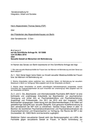 Drucksache 18 / 13 686 Schriftliche Anfrage 18. Wahlperiode Schriftliche Anfrage des Abgeordneten Thomas Seerig (FDP) vom 05. März 2018 (Eingang beim Abgeordnetenhaus am 07. März 2018) zum Thema: Sexuelle Gewalt an Menschen mit Behinderung und Antwort vom 22. März 2018 (Eingang beim Abgeordnetenhaus am 26. Mrz. 2018) Die Drucksachen des Abgeordnetenhauses sind bei der Kulturbuch-Verlag GmbH zu beziehen. Hausanschrift: Sprosserweg 3, 12351 Berlin-Buckow · Postanschrift: Postfach 47 04 49, 12313 Berlin, Telefon: 6 61 84 84; Telefax: 6 61 78 28.
