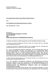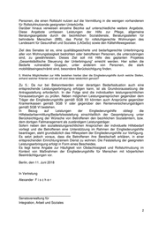 Personen, die einen Rollstuhl nutzen auf die Vermittlung in die wenigen vorhandenen für Rollstuhlnutzende geeigneten Unterkünfte. Darüber hinaus verweisen einzelne Bezirke auf unterschiedliche weitere Angebote. Diese Angebote umfassen Leistungen der Hilfe zur Pflege, allgemeine Beratungsangebote durch die bezirklichen Sozialdienste, Beratungsstellen für behinderte Menschen (BfB), das Portal für rollstuhlgerechte Wohnungen des Landesamt für Gesundheit und Soziales (LAGeSo) sowie den Kältehilfewegweiser. Ziel des Senates ist es, eine qualitätsgesicherte und bedarfsgerechte Unterbringung aller von Wohnungslosigkeit bedrohten oder betroffenen Personen, die unterzubringen sind, zu gewährleisten. Dieses Ziel soll mit Hilfe des geplanten Projektes „Gesamtstädtische Steuerung der Unterbringung“ erreicht werden. Hier sollen die Bedarfe vulnerabler Gruppen, unter anderem von Personen, die stark mobilitätseingeschränkt sind, besondere Berücksichtigung finden. 5. Welche Möglichkeiten zur Hilfe bestehen hierbei über die Eingliederungshilfe durch welche Stellen, anhand welcher Kriterien und wie oft wird diese tatsächlich genutzt? Zu 5.: Da nur bei Bekanntwerden einer derartigen Bedarfssituation auch eine entsprechende Leistungserbringung erfolgen kann, ist als Grundvoraussetzung die Antragsstellung erforderlich. In der Folge sind die individuellen leistungsrechtlichen Voraussetzungen zu prüfen. Neben möglichen Leistungsansprüchen gegenüber dem Träger der Eingliederungshilfe gemäß SGB XII könnten auch Ansprüche gegenüber Krankenkassen gemäß SGB V oder gegenüber den Rentenversicherungsträgern gemäß SGB VI bestehen. In Bezug auf Leistungen der Eingliederungshilfe obliegt die Hilfebedarfsermittlung/Bedarfsfeststellung einschließlich der Gesamtplanung unter Berücksichtigung der Wünsche von Betroffenen den bezirklichen Sozialämtern, bzw. dem dortigen Fallmanagement als zuständigem Leistungsträger. Sofern neben den sozialleistungsrechtlichen Ansprüchen der individuelle Hilfebedarf vorliegt und die Betroffenen eine Unterstützung im Rahmen der Eingliederungshilfe beantragen, steht grundsätzlich das Hilfesystem der Eingliederungshilfe zur Verfügung. Es setzt jedoch voraus, dass die Betroffenen ihre Bereitschaft erklären, in einer entsprechenden Einrichtung/einem Dienst zu wohnen. Die Feststellung der geeigneten Leistungserbringung erfolgt in Form eines Bescheides. Es liegt keine Angabe zur Häufigkeit von Obdachlosigkeit und Rollstuhlnutzung im Kontext von Maßnahmen der Eingliederungshilfe für Menschen mit körperlichen Beeinträchtigungen vor. Berlin, den 11. Juni 2018 In Vertretung Alexander F i s c h e r _____________________________ Senatsverwaltung für Integration, Arbeit und Soziales 2