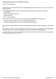 Verfahrenshinweise zum Aufenthalt in Berlin Soweit der Ausländer sich weigert, beim Stellen des Rückübernahmeersuchens mitzuwirken, etwa indem er zwingend notwendige oder sonstige Angaben, die der jugoslawischen Seite nach Möglichkeit zur Verfügung gestellt werden sollen, verweigert, ist die Duldung mit folgenden Nebenbestimmungen zu versehen: “Erwerbstätigkeit nicht gestattet”, ...weggefallen... In den übrigen Fällen ist die Duldung mit den Auflagen “Beschäftigung nur nach Erlaubnis der Ausländerbehörde (§ 4 Abs 2 AufenthG)”, “Selbständige Tätigkeit nicht gestattet” zu erteilen. Personen, bei denen entsprechende Übernahmeersuchen positiv beschieden sind, wird die Duldung ohne Änderung der Auflagen verlängert. In jedem dieser Fälle kann eine erneute Vorsprache nach § 82 Abs. 4 AufenthG angeordnet werden. Spricht die Person trotz Anordnung nach § 82 Abs. 4 nach Ablauf der Geltungsdauer nicht wieder vor, kann sie gem. § 50 Abs. 6 i. V. m. § 82 Abs. 4 AufenthG zur Festnahme ausgeschrieben werden . Soweit ein Abschiebungstermin bestimmbar ist, ist die Duldung entsprechend zu befristen. Gegebenenfalls sind die Duldungen zu widerrufen, wenn ein Abschiebungstermin bestimmbar ist und die Duldungsdauer sich über diesen Termin erstreckt. Ausreisepflichtige serbische Staatsangehörige, für die ein Ersuchen auf Rückübernahme bereits gestellt wurde, eine Zustimmung aber noch nicht vorliegt, erhalten grundsätzlich eine auf sechs Monate befristete Duldung. Zwar soll lt. EU-Rückübernahmeabkommen eine Antwort auf ein Ersuchen in spätestens 16 Tagen vorliegen, entsprechend belastbare Erkenntnisse liegen jedoch hierzu nicht vor. Bei Vorliegen einer Zustimmung wird die Duldung für drei Monate erteilt, es sei denn, eine Abschiebung ist unverzüglich durchführbar. 3. Freiwillige Ausreise Ist der Ausländer bereit, freiwillig auszureisen, soll von der Einbehaltung des Passes abgesehen bzw. ein einbehaltener Pass ausgehändigt werden, wenn keine Zweifel an der Ausreisebereitschaft bestehen. Wer endgültig auf dem Landweg nach Serbien zurückkehren will und im Besitz eines gültigen Passes oder eines zur Rückkehr berechtigenden Passersatzes ist, erhält - um die Reise durch die Transitstaaten zu ermöglichen – eine Rückkehrvignette, die in den Pass bzw. Passersatz geklebt wird. Sie ist nicht zu befristen, eine Ausreisefrist wird nicht verfügt. Gleichzeitig ist - soweit noch nicht geschehen - eine Grenzübertrittsbescheinigung auszuhändigen. Sofern aufenthaltsrechtliche Anträge gestellt wurden oder entsprechende Rechtsbehelfsverfahren anhängig sind, sind diese zuvor zurückzunehmen (Formbrief LABO 4394). Es ist eine Verwaltungsgebühr von 10,00 € zu erheben (§ 47 Abs. 1 Nr. 9 AufenthV), es sei denn, der Antragsteller bezieht Hilfe zum Lebensunterhalt. Anlage 1 (JUGWOHN) Prezime Familienname __________________________________________________ Ime Vorname __________________________________________________ Datum rodjenja Geburtsdatum __________________________________________________ Ime oca Name des Vaters __________________________________________________ Dieses PDF wurde erstellt am: 04.03.2020 Seite 845 von 877