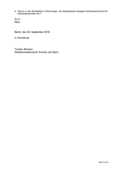 Senatsverwaltung für Inneres und Sport Frau Abgeordnete Cornelia Seibeld (CDU) über den Präsidenten des Abgeordnetenhauses von Berlin über Senatskanzlei - G Sen - Antwort auf die Schriftliche Anfrage Nr. 18/16098 vom 23. August 2018 über „Hitzebedingte Gesundheitsprobleme bei der Berliner Polizei durch nicht ange- passte Ausrüstung“ ----------------------------------------------------------------------------------------------------------------- Im Namen des Senats von Berlin beantworte ich Ihre Schriftliche Anfrage wie folgt: 1. Wie viele Polizistinnen und Polizisten haben durch das Tragen von Dienstkleidung (Schutzausrüs- tung) oder den Aufenthalt in Räumen und Fahrzeugen, die für die kürzlich aufgetretenen Hitzetem- peraturen (30 C und mehr) nicht geeignet ist bzw. sind, hitzebedingte Gesundheitsprobleme ge- habt oder sind deswegen erkrankt? Zu 1.: Hierzu können keine Angaben gemacht werden, da bei einer Krankmeldung keine Diagnose angegeben werden muss. 2. Welche konkreten Vorkehrungen hat der Senat in der jüngsten Hitzewelle getroffen, um der zu erwartenden angespannten Personalsituation begegnen zu können? Zu 2.: Eine außergewöhnlich angespannte Personalsituation war aufgrund der klimatischen Bedingungen nicht zu erwarten und ist auch nicht eingetreten. Aus diesem Grund gab es auch keine konkreten Vorkehrungen im Rahmen der diesjährigen Hitzewelle. Die Behörde hat eine funktionierende Arbeitsschutz- und Gesundheitsmanagement- organisation und arbeitet regelmäßig daran, die Arbeitsbedingungen für die Mitarbei- tenden so zu gestalten, dass Gesundheitsgefährdungen auf ein Minimum reduziert werden. Darüber hinaus sind alle Führungskräfte gehalten, mit Hilfe von angemes- senen technischen oder organisatorischen Maßnahmen auf besondere Situationen zu reagieren. 3. Welche Vorsorge trifft der Senat grundsätzlich, dass die Einsatzfähigkeit der Berliner Polizei ge- währleistet ist, wenn zum Beispiel aufgrund von Hitzeereignissen ad hoc überdurchschnittlich viele Polizistinnen und Polizisten erkranken? Zu 3.: Die Polizei Berlin ist jederzeit in der Lage, ihre Einsatzbereitschaft zu gewährleisten. Seite 1 von 2