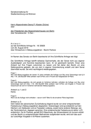 Senatsverwaltung für Stadtentwicklung und Wohnen Herrn Abgeordneten Georg P. Kössler (Grüne) über den Präsidenten des Abgeordnetenhauses von Berlin über Senatskanzlei - G Sen - Antwort auf die Schriftliche Anfrage Nr. 18/ 20826 vom 26. August 2019 über Klimaschutz in Bebauungsplänen - Bezirk Pankow Im Namen des Senats von Berlin beantworte ich Ihre Schriftliche Anfrage wie folgt: Die Schriftliche Anfrage betrifft teilweise Sachverhalte, die der Senat nicht aus eigener Zuständigkeit und Kenntnis beantworten kann. Er ist gleichwohl bemüht, Ihnen eine Antwort auf Ihre Fragen zukommen zu lassen und hat daher den Bezirk um eine Stellungnahme gebeten, die von dort in eigener Verantwortung erstellt und dem Senat übermittelt wurde. Sie wird nachfolgend wiedergegeben. Frage 1: Wie viele Bebauungspläne der letzten 10 Jahre enthalten die Auflage zum Bau einer Solaranlage nach § 9 Abs. 1 Nr. 23b BauGB? Bitte auflisten nach B-Plan und in Prozent der festgesetzten B-Pläne. Frage 2: Wie viele Bebauungspläne, die sich gerade im Verfahren befinden, enthalten die Auflage zum Bau einer Solaranlage nach § 9 Abs. 1 Nr. 23b BauGB? Bitte auflisten nach B-Plan und Angabe in Prozent der Gesamtzahl der sich im Verfahren befindenden Bebauungspläne. Antwort zu 1 und 2: Keine. Frage 3: Wenn sie die Auflage nicht enthalten – warum nicht? Bitte für die einzelnen Pläne begründen. Antwort zu 3: Dem Gebot der planerischen Zurückhaltung folgend wurde von einer entsprechenden Festsetzung in Bebauungsplänen abgesehen. Solaranlagen sind grundsätzlich auf den Dächern von Gebäuden und an Fassaden zulässig, soweit keine anderen Belange, wie der Denkmalschutz, dagegen sprechen. Eine entsprechende Festsetzung ist daher i.d.R. entbehrlich. Da für Pankow, gemäß BVV-Beschluss, der Klimanotstand vor kurzem erklärt und der Bezirk zu entsprechenden Maßnahmen aufgefordert wurde, wird sich das auch auf zukünftige Vorgaben in B-Plänen auswirken. 1