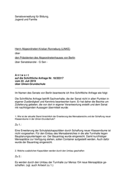 Senatsverwaltung für Bildung, Jugend und Familie Herrn Abgeordneten Kristian Ronneburg (LINKE) über den Präsidenten des Abgeordnetenhauses von Berlin über Senatskanzlei - G Sen - Antwort auf die Schriftliche Anfrage Nr. 18/20317 vom 22. Juli 2019 über Ulmen-Grundschule ___________________________________________________________________ Im Namen des Senats von Berlin beantworte ich Ihre Schriftliche Anfrage wie folgt: Die Schriftliche Anfrage betrifft Sachverhalte, die der Senat nicht in allen Punkten in eigener Zuständigkeit und Kenntnis beantworten kann. Er hat daher die Bezirke um Zulieferung gebeten, die von dort in eigener Verantwortung erstellt und dem Senat mit nachfolgenden Aussagen übermittelt wurde: 1. Wie ist der aktuelle Stand hinsichtlich der Erweiterung des Mensabereichs und der Schaffung neuer Klassenräume in der Ulmen-Grundschule? Zu 1.: Eine Erweiterung der Schulplatzkapazitäten durch Schaffung neuer Klassenräume ist nicht vorgesehen. Für den Einbau des Mensabereiches in die alte Turnhalle liegen Bauplanungsunterlagen vor. Der Bauantrag wurde eingereicht. Damit kurzfristiger Mensaplätze zur Verfügung stehen, sollen Container aufgestellt werden. Auch dafür wurde der Bauantrag eingereicht. 2. Welche zusätzlichen Kapazitäten werden durch den Umbau geschaffen Zu 2.: Es werden durch den Umbau der Turnhalle zur Mensa 154 neue Mensaplätze ge- schaffen. (vgl. auch Antwort zu 1.)