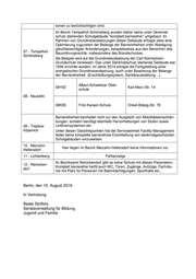 sonen zu berücksichtigen sind. Im Bezirk Tempelhof-Schöneberg wurden bisher keine unter Denkmal- schutz stehenden Schulgebäude "komplett barrierefrei" umgebaut. Im Rahmen von Grundinstandsetzungen dieser Gebäude erfolgte stets eine Optimierung zugunsten der Belange der Barrierefreiheit unter Abwägung gleichberechtigter Anforderungen, beispielsweise aus den Bereichen des 07 - Tempelhof - Bauordnungsrechts, insbesondere des Brandschutzes. Schöneberg Als Beispiel wird auf die Grundinstandsetzung der Carl-Sonnschein- Grundschule verwiesen. Das unter Denkmalschutz stehende Gebäude war 1956 errichtet worden; im Jahre 2014 erfolgte die Fertigstellung einer energetischen Grundinstandsetzung, auch unter Beachtung der Belange der Barrierefreiheit (Erschließungssystem, Sanitärausstattung…). Albert-Schweitzer Ober- 08Y02 Karl-Marx-Str. 14 schule 08 - Neukölln 08K06 Fritz-Karsen-Schule Onkel-Bräsig-Str. 76 Barrierefreiheit beinhaltet nicht nur den Ausgleich von Mobilitätseinschrän- kungen, sondern benötigt ebenfalls Hervorhebungen von Stufen sowie 09 - Treptow- Leitliniensystemen etc. Köpenick Unter diesen Gesichtspunkten hat die Serviceeinheit Facility Management leider keine komplette barrierefreie Erschließung von denkmalgeschützten Schulgebäuden vorzuweisen. 10 - Marzahn- Hier liegen im Bezirk Marzahn-Hellersdorf keine Informationen vor. Hellersdorf 11 - Lichtenberg Fehlanzeige Im Bezirksamt Reinickendorf gibt es keine Schule mit diesen Parametern. 12 - Reinicken- Komplett barrierefrei heißt auch WC, Türen, Zugänge, Aufzüge, Fachräu- dorf me mit Platz für Personen mit Beeinträchtigungen, Sporthalle etc… Berlin, den 10. August 2019 In Vertretung Beate Stoffers Senatsverwaltung für Bildung, Jugend und Familie