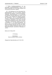 Abgeordnetenhaus Berlin – 17. Wahlperiode Drucksache 17 / 15 449 7. Welche Ausbildungsmöglichkeiten mit dem Schwerpunkt Wirtschaftskriminalistik werden an den Berliner Hochschulen und Universitäten angeboten und wie bewertet der Senat dieses Angebot? Zu 7.: Ein Studiengang mit dem Schwerpunkt Wirt- schaftskriminalistik wird von den Berliner staatlichen Hochschulen nicht angeboten. Es kann auf den Bachelor- studiengang "Polizeivollzugsdienst" an der Hochschule für Wirtschaft und Recht hingewiesen werden, der auf Aufgaben in den Laufbahnen des gehobenen Kriminal- und Schutzpolizei- sowie des Gewerbeaußendienstes vorbereitet. Entsprechende Lehrinhalte finden sich auch in juristischen Vorlesungen an der Freien Universität Berlin und der Humboldt-Universität zu Berlin zum Straf- , Wirtschafts- und Steuerrecht. Gleiches gilt auch für Veranstaltungen in der Betriebswirtschaftslehre. Der Senat ist von der hochwertigen Qualität der Berliner Hochschulausbildung überzeugt. Ihm sind keine Überle- gungen der staatlichen Hochschulen bekannt, einen auf Wirtschaftskriminalistik spezialisierten Studiengang an- zubieten. Berlin, den 16. Februar 2015 In Vertretung Bernd Krömer Senatsverwaltung für Inneres und Sport (Eingang beim Abgeordnetenhaus am 23. Feb. 2015) 4
