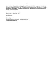 Senatsverwaltung für Justiz, Verbraucherschutz und Antidiskriminierung Herrn Abgeordneten Marcel Luthe (FDP) über den Präsidenten des Abgeordnetenhauses von Berlin über Senatskanzlei - G Sen - Antwort auf die Schriftliche Anfrage Nr. 18/12 525 vom 18. Oktober 2017 über Diplomaten in Berlin ------------------------------------------------------------------------------------------------------------------- Im Namen des Senats von Berlin beantworte ich Ihre Schriftliche Anfrage wie folgt: 1. Wie viele strafrechtliche Ermittlungsverfahren sind wegen Verfahrenshindernissen nach §§ 18 ff GVG in den Jahren 1996 bis 2016 und wie viele bisher im Jahr 2017 eingestellt? Zu 1.: In dem bei der Staatsanwaltschaft Berlin eingesetzten Aktenverwaltungssystem MESTA (Mehrländer-Staatsanwaltschafts-Automation) werden alle Verfahren, die sich gegen Personen mit Immunitätsstatus richten, unter der Nebenverfahrensklasse „Immu“ erfasst. Dies betrifft aber auch diejenigen, die politische Immunität genießen, wie zum Beispiel Bundestags- oder Landtagsabgeordnete. Eine Aufschlüsselung nach Personen, die dem diplomatischen Schutz der §§ 18 ff. Gerichtsverfassungsgesetz (GVG) unterfal- len, erfolgt nicht, so dass Zahlen zu den insoweit zwischen 1996 und 2017 geführten und eingestellten Verfahren nicht mitgeteilt werden können. 2. Werden alle Straftaten zunächst erfasst oder entspricht es polizeilicher Praxis, Strafanzeigen gegen durch die §§ 188 ff. GVG geschützten Personen gar nicht erst aufzunehmen? Zu 2.: Das Legalitätsprinzip gemäß § 163 Strafprozessordnung (StPO) verpflichtet jeden Polizeibeamten, Straftaten zu erforschen und alle keinen Aufschub gestattenden Anord- nungen zu treffen. Die Polizei Berlin hat daher grundsätzlich bei Bekanntwerden von zu- reichenden tatsächlichen Anhaltspunkten für das Vorliegen eines strafbaren Sachverhalts eine Strafanzeige zu fertigen, auch soweit der in §§ 18 ff. GVG genannte Personenkreis betroffen ist. Bei der Staatsanwaltschaft Berlin wird aufgrund der polizeilichen oder auch