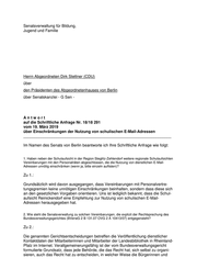Senatsverwaltung für Bildung, Jugend und Familie Herrn Abgeordneten Dirk Stettner (CDU) über den Präsidenten des Abgeordnetenhauses von Berlin über Senatskanzlei - G Sen - Antwort auf die Schriftliche Anfrage Nr. 18/18 291 vom 19. März 2019 über Einschränkungen der Nutzung von schulischen E-Mail-Adressen ___________________________________________________________________ Im Namen des Senats von Berlin beantworte ich Ihre Schriftliche Anfrage wie folgt: 1. Haben neben der Schulaufsicht in der Region Steglitz-Zehlendorf weitere regionale Schulaufsichten Vereinbarungen mit den Personalräten abgeschlossen, die die Nutzung von dienstlichen E-Mail- Adressen unnötig einschränken (wenn ja, bitte einzeln auflisten)? Zu 1.: Grundsätzlich wird davon ausgegangen, dass Vereinbarungen mit Personalvertre- tungsgremien keine unnötigen Einschränkungen beinhalten, sondern dass diese sich an den gesetzlichen Vorgaben orientieren. Uns ist lediglich bekannt, dass die Schul- aufsicht Reinickendorf eine Empfehlung zur Nutzung von schulischen E-Mail- Adressen herausgegeben hat. 2. Wie steht die Senatsverwaltung zu solchen Vereinbarungen, die explizit der Rechtsprechung des Bundesverwaltungsgerichtes (BVerwG 2 B 131.07 OVG 2 A 10413/07) entgegensteht? Zu 2.: Die genannten Gerichtsentscheidungen betreffen die Veröffentlichung dienstlicher Kontaktdaten der Mitarbeiterinnen und Mitarbeiter der Landesbibliothek in Rheinland- Pfalz im Internet. Verallgemeinerungsfähig ist der vom Bundesverwaltungsgericht formulierte Grundsatz, dass jede Behörde, die das Recht hat, sich selbst zu organi- sieren, auch das Recht hat zu entscheiden, in welcher Weise die Bürgerinnen und