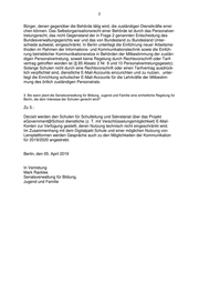 2 Bürger, denen gegenüber die Behörde tätig wird, die zuständigen Dienstkräfte errei- chen können. Das Selbstorganisationsrecht einer Behörde ist durch das Personalver- tretungsrecht, das nicht Gegenstand der in Frage 2 genannten Entscheidung des Bundesverwaltungsgerichts war und das von Bundesland zu Bundesland Unter- schiede aufweist, eingeschränkt. In Berlin unterliegt die Einführung neuer Arbeitsme- thoden im Rahmen der Informations- und Kommunikationstechnik sowie die Einfüh- rung betrieblicher Kommunikationsnetze in Behörden der Mitbestimmung der zustän- digen Personalvertretung, soweit keine Regelung durch Rechtsvorschrift oder Tarif- vertrag getroffen worden ist (§ 85 Absatz 2 Nr. 9 und 10 Personalvertretungsgesetz). Solange Schulen nicht durch eine Rechtsvorschrift oder einen Tarifvertrag ausdrück- lich verpflichtet sind, dienstliche E-Mail-Accounts einzurichten und zu nutzen, unter- liegt die Einrichtung schulischer E-Mail-Accounts für die Lehrkräfte der Mitbestim- mung des örtlich zuständigen Personalrats. 3. Bis wann plant die Senatsverwaltung für Bildung, Jugend und Familie eine einheitliche Regelung für Berlin, die dem Interesse der Schulen gerecht wird? Zu 3.: Derzeit werden den Schulen für Schulleitung und Sekretariat über das Projekt eGovernment@School dienstliche (z. T. mit Verschlüsselungsmöglichkeit) E-Mail- Konten zur Verfügung gestellt, deren Nutzung technisch nicht eingeschränkt wird. Im Zusammenhang mit dem Digitalpakt Schule und einer möglichen Nutzung von Lernplattformen werden Gespräche auch zu den Möglichkeiten der Kommunikation für 2019/2020 angestrebt. Berlin, den 05. April 2019 In Vertretung Mark Rackles Senatsverwaltung für Bildung, Jugend und Familie