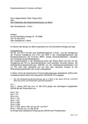 Drucksache 18 / 15 086 Schriftliche Anfrage 18. Wahlperiode Schriftliche Anfrage des Abgeordneten Peter Trapp (CDU) vom 18. Mai 2018 (Eingang beim Abgeordnetenhaus am 22. Mai 2018) zum Thema: Geldwäsche in Berlin und Antwort vom 31. Mai 2018 (Eingang beim Abgeordnetenhaus am 06. Jun. 2018) Die Drucksachen des Abgeordnetenhauses sind bei der Kulturbuch-Verlag GmbH zu beziehen. Hausanschrift: Sprosserweg 3, 12351 Berlin-Buckow · Postanschrift: Postfach 47 04 49, 12313 Berlin, Telefon: 6 61 84 84; Telefax: 6 61 78 28.
