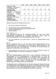 2010 2011 2012 2013 2014 2015 2016 § 261 Abs. 1 StGB Geldwäsche – Verschleierung unrechtmäßig erlangter Vermögenswerte 63 69 72 65 50 43 38 § 261 Abs. 2 StGB Geldwäsche – Verschaffen, Verwahren und Verwenden unrechtmäßig erlangter 12 25 8 7 4 3 2 Vermögenswerte § 261 Abs. 4 StGB Besonders schwerer Fall der Geldwäsche 2 14 3 5 4 2 4 § 261 Abs. 5 StGB Leichtfertige Geldwäsche 2 6 64 69 67 51 44 Zahlen für das Jahr 2017 liegen noch nicht vor. 8. Wie viele davon betrafen Immobilienkäufe? 9. Wie viele der unter Frage 7 benannten Fälle betrafen a. russische, tschetschenische und andere osteuropäische Käufer b. arabisch-stämmige Käufer und c. italienische Käufer? Zu 8. und 9. a) – c): Eine statistische Erfassung der Ermittlungsverfahren, die eine den Fragen entsprechende Eingrenzung der Verfahren ermöglichen würde, findet im Aktenverwaltungssystem der Strafverfolgungsbehörden nicht statt. 10. Wie viele Ermittlerinnen und Ermittler werden im Bereich der Geldwäschedelikte aktuell eingesetzt? Zu 10.: Bei der zuständigen GFG im LKA sind aktuell zwölf Polizeidienstkräfte und ein Tarifbeschäftigter im Ermittlungsdienst der Polizei Berlin, sieben Beamtinnen und Beamte des Zolls sowie zwei Beamtinnen und Beamte der Steuerfahndung als sogenannte Ermittlerinnen und Ermittler tätig. 11. Welche Maßnahmen plant der Senat, um mehr und effizientere Kontrollen im Bereich der Geldwäsche allgemein und speziell im Immobiliensektor zu schaffen? Zu 11.: Das neue Geldwäschegesetz (GwG) führt zu einer erheblichen Erweiterung der Pflichtaufgaben für die Aufsichtsbehörde im Nichtfinanzsektor u.a. durch die Verdoppelung des Verpflichtetenkreises im Land Berlin, durch Absenkung der Bargeldgrenze von 15.000 auf 10.000 EUR im Bereich der Güterhändler (z.B. Autohandel, Juweliere), erhöhte Anforderungen an Vor-Ort-Kontrollen und Überprüfungen von Risikoanalysen der Verpflichteten. Die Mitarbeiterinnen und Mitarbeiter bei der Senatsverwaltung für Wirtschaft, Energie und Betriebe werden die Verpflichteten des GwG (u.a. Immobilienmakler) informieren und kontrollieren sowie Ordnungswidrigkeitenverfahren einleiten, sollte gegen Identifizierungs- oder Verdachtsmeldepflichten verstoßen worden sein. Seite 3 von 4