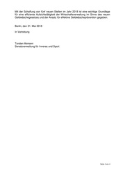 Mit der Schaffung von fünf neuen Stellen im Jahr 2018 ist eine wichtige Grundlage für eine effiziente Aufsichtstätigkeit der Wirtschaftsverwaltung im Sinne des neuen Geldwäschegesetzes und der Ansatz für effektive Geldwäscheprävention gegeben. Berlin, den 31. Mai 2018 In Vertretung Torsten Akmann Senatsverwaltung für Inneres und Sport Seite 4 von 4