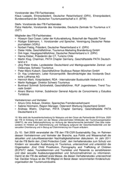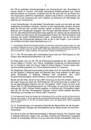 4 Vorsitzender des ITB-Fachbeirates: Klaus Laepple, Ehrenpräsident, Deutscher ReiseVerband (DRV), Ehrenpräsident, Bundesverband der Deutschen Tourismuswirtschaft e.V. (BTW) Stellv. Vorsitzende des ITB-Fachbeirates: Petra Hedorfer, Vorsitzende des Vorstandes, Deutsche Zentrale für Tourismus e.V. (DZT) Mitglieder des ITB-Fachbeirates: • Hüseyin Gazi Cosan, Leiter der Kulturabteilung, Botschaft der Republik Türkei • Rüdiger Edelmann, 1. Vorsitzender und Sprecher, Vereinigung Deutscher Reise- journalisten (VDRJ) • Norbert Fiebig, Präsident, Deutscher ReiseVerband e.V. (DRV) • Dieter Hütte, Geschäftsführer, Tourismus-Marketing Brandenburg GmbH • Dirk Inger, Hauptgeschäftsführer, Deutscher ReiseVerband e.V. (DRV) • Hanna Kleber, Präsidentin der CT, Turismo Chile • Martin Klug, Chairman, PATA Chapter Germany, Geschäftsstelle PATA Deutsch- land e.V. • Jörg Peter Krebs, Landesleiter Deutschland und Marktgruppenleiter Zentral- und Osteuropa, Schweiz Tourismus • Peter-Mario Kubsch, Geschäftsführer Studiosus Reisen München GmbH • Dr. Kay Lindemann, Leiter Konzernpolitik- Bevollmächtigter des Vorstands Deut- sche Lufthansa AG • Heinrich Marti, Vizepräsident, RDA - Internationaler Bustouristik Verband e.V. • Martin Nydegger. Direktor Schweiz Tourismus • Burkhard Schmidt Schönefeldt, Geschäftsführer, RUF Jugendreisen, Trend Tou- ristik GmbH • Alvaro Blanco Volmer, Subdirector General Adjunto de Conocimiento y Estudios Turísticos Vertreterinnen und Vertreter: • Arturo Ortíz Arduan, Direktor, Spanisches Fremdenverkehrsamt • Sabine Holzmann, Region Manager, Österreich Werbung Deutschland GmbH • Andreas Wiehn, Chairman, PATA Chapter Germany, Geschäftsstelle PATA Deutschland e.V. 10. Wie steht die Auswahlentscheidung für Malaysia und den Oman als Partnerländer 2019 bzw. 2020 der ITB im Einklang mit dem von der Messe unterzeichneten Ethikkodex der Tourismusorganisation UNWTO, der eine Selbstverpflichtung zur Achtung der Menschenrechte beinhaltet? Dies bitte insbe- sondere im Hinblick auf Diskriminierung und Verfolgung aufgrund der Geschlechtsidentität und der sexuellen Orientierung und in Bezug auf Diskriminierung von Frauen erläutern. Zu 10.: Seit 2009 veranstaltet die ITB den ITB-CSR-Sustainability Day, im Rahmen dessen Vertreterinnen und Vertreter der Branche, aus Politik und Wissenschaft die aktuellen und zukunftsweisenden Nachhaltigkeitsthemen diskutieren. Im Jahr 2011 hat die ITB Berlin den „Child Protection Code“, den Verhaltenskodex zum Schutz von Kindern vor sexueller Ausbeutung im Tourismus, unterzeichnet und unterstützt die Organisation „End Child Prostitution, Pornography and Trafficking of Children (ECPAT)“ dabei, Touristikerinnen und Touristiker und Reisende zu sensibilisieren und über sexuelle Ausbeutungspraktiken und Schutzmaßnahmen zu informieren. Damit ist die ITB die weltweit erste Messe, die diesen Verhaltenskodex unterzeichnet hat. Darüber hinaus ist die ITB Mitglied im Beirat dieser renommierten Kinderschutz- organisation der Tourismusindustrie.