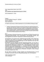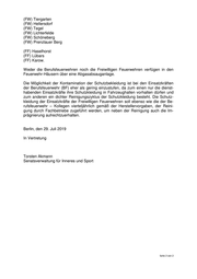 Senatsverwaltung für Inneres und Sport Herrn Abgeordneten Marcel Luthe (FDP) über den Präsidenten des Abgeordnetenhauses von Berlin über Senatskanzlei - G Sen - Antwort auf die Schriftliche Anfrage Nr. 18/20248 vom 15. Juli 2019 über Feuerkrebs II ----------------------------------------------------------------------------------------------------------------- Im Namen des Senats von Berlin beantworte ich Ihre Schriftliche Anfrage wie folgt: 1. Entsprechen gegenwärtig alle Standorte der Berliner Feuerwehr den Unfallverhütungsvorschrif- ten? Wenn nein, welche nicht, inwiefern und aus welchen Gründen ist dieser Zustand bisher nicht abgestellt worden? (Exemplarisch sei darauf verwiesen, dass gegenwärtig nicht alle Fahrzeug- hallen der Berliner Feuerwehr mit Abgasabsauganlagen ausgestattet sind, so dass Emissionen nicht nur eingeatmet werden, sondern sich auch in der dort hängenden Schutzkleidung ablagern. Bitte gesondert ausweisen, welche der Fahrzeughallen der Berliner Feuerwehr aktuell nicht über eine voll funktionsfähige Abgasabsauganlage verfügen.) Zu 1.: Nach derzeitigem Sachstand entsprechen alle Standorte der Berliner Feuerwehr den Unfallverhütungsvorschriften. Alle verantwortlichen Führungskräfte handeln nach dem Regelwerk der Deutschen Gesetzlichen Unfallversicherung (DGUV). Die Einhaltung und Umsetzung der Unfallverhütungsvorschriften (UVV) erfolgt dann, wie bereits in der Antwort zur Drucksache 18/19963 beschrieben, durch die regel- mäßig durchgeführten Sicherheitsbegehungen auf allen Standorten durch die Fach- kräfte für Arbeitssicherheit (FASI). Die Gefahren aus den erwähnten fehlenden Abgasabsauganlagen, wie auch alle an- deren evtl. auftretenden Gefährdungen für die Beschäftigten, werden gemäß einer standardisierten Maßnahmen- Hierachie (TOP – Hierarchie) weiter minimiert. Auf den Standorten ohne Abgasabsauganlage (T – technische Maßnahme) werden Organi- satorische Maßnahme, wie Beschaffung von Fahrzeugen mit neuester Abgastechnik oder Querbelüften von Fahrzeughallen bis hin zu Persönlichen Maßnahmen, wie Aufenthaltsverbot und Unterweisung der Mitarbeiter durchgeführt. Diese Herange- hensweise entspricht den UVVs. Bei der Berliner Feuerwehr verfügen folgende acht Berufsfeuerwachen und drei Freiwillige Feuerwehren über eine Abgasabsauganlage in den Fahrzeughallen: (FW) Charlottenburg-Nord (FW) Schillerpark Seite 1 von 2
