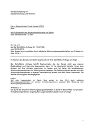 Drucksache 18 / 21 406 Schriftliche Anfrage 18. Wahlperiode Schriftliche Anfrage des Abgeordneten Frank Henkel (CDU) vom 25. Oktober 2019 (Eingang beim Abgeordnetenhaus am 29. Oktober 2019) zum Thema: Ankauf von Immobilien durch städtische Wohnungsbaugesellschaften von Privaten im Jahr 2018-I und Antwort vom 12. November 2019 (Eingang beim Abgeordnetenhaus am 18. Nov. 2019) Die Drucksachen des Abgeordnetenhauses sind bei der Kulturbuch-Verlag GmbH zu beziehen. Hausanschrift: Sprosserweg 3, 12351 Berlin-Buckow · Postanschrift: Postfach 47 04 49, 12313 Berlin, Telefon: 6 61 84 84; Telefax: 6 61 78 28.