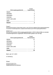 Anzahl Wohnungsbaugesellschaft Liegenschaften degewo 1 GESOBAU 0 GEWOBAG 0 HOWOGE 0 STADT UND LAND 0 WBM 1 Gesamt 2 Frage 2: Wie viele Wohneinheiten im Bezirk Mitte wurden im Jahr 2018 durch städtische Wohnungsbaugesellschaften von privaten Immobilieneigentümern angekauft (bitte Gliederung nach Wohnungsbaugesellschaften)? Antwort zu 2: Die durch die einzelnen Wohnungsbaugesellschaften in 2018 im Bezirk Mitte von privaten Immobilieneigentümern angekauften Wohneinheiten gliedern sich wie folgt: Anzahl Wohnungsbaugesellschaft Wohneinheiten degewo 27 GESOBAU 0 GEWOBAG 0 HOWOGE 0 STADT UND LAND 0 WBM 7 Gesamt 34 Berlin, den 12.11.2019 In Vertretung Scheel ................................ Senatsverwaltung für Stadtentwicklung und Wohnen 2