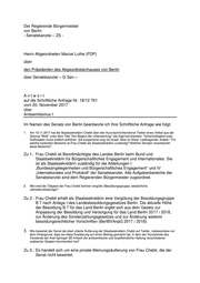 Der Regierende Bürgermeister von Berlin - Senatskanzlei – ZS - Herrn Abgeordneten Marcel Luthe (FDP) über den Präsidenten des Abgeordnetenhauses von Berlin über Senatskanzlei – G Sen – Antwort auf die Schriftliche Anfrage Nr. 18/12 761 vom 20. November 2017 über Antisemitismus I Im Namen des Senats von Berlin beantworte ich Ihre Schriftliche Anfrage wie folgt: 1. Am 19.11.2017 hat die Staatssekretärin Chebli über den Kurznachrichtendienst Twitter einen Artikel aus der Zeitung "Welt" unter dem Titel "Der Beginn der Unterwerfung" wie folgt kommentiert: "Scheinheiligkeit arab. Golfstaaten muss endlich aufhören. Sie kooperieren eng mit Israel, Rest ist Show. Leidtragende: Araber." Für welche konkreten Bereiche ist Frau Chebli als Staatssekretärin zuständig? Welcher Senator verantwortet diese Bereiche? Zu 1.: Frau Chebli ist Bevollmächtigte des Landes Berlin beim Bund und Staatssekretärin für Bürgerschaftliches Engagement und Internationales. Sie ist als Staatssekretärin zuständig für die Abteilungen I „Bundesangelegenheiten und Bürgerschaftliches Engagement“ und IV „Internationales und Protokoll“ der Senatskanzlei. Alle Aufgabenbereiche der Senatskanzlei sind dem Regierenden Bürgermeister zugeordnet. 2. Wie wird die Tätigkeit der Frau Chebli konkret vergütet (Besoldungsgruppe, tatsächliche Jahresbruttobezüge? Zu 2.: Frau Chebli erhält als Staatssekretärin eine Vergütung der Besoldungsgruppe B 7 nach Anlage I des Landesbesoldungsgesetzes Berlin. Die aktuelle Höhe der Besoldung B 7 für das Land Berlin ergibt sich aus dem Gesetz zur Anpassung der Besoldung und Versorgung für das Land Berlin 2017 / 2018, zur Änderung des Sonderzahlungsgesetzes und zur Änderung weiterer besoldungsrechtlicher Vorschriften (BerlBVAnpG 2017 / 2018). 3. Wie bewertet der Senat die oben zitierte Äußerung der Staatssekretärin Chebli auf Twitter, insbesondere vor dem Hintergrund, dass sie diese Erwiderung auf einen Beitrag gemacht hat, in dem der Vorsitzende des Vorstands der Axel Springer SE kritisch die antisemitische und israelfeindliche Haltung verschiedener arabischer Staaten kommentiert hat? Zu 3.: Es handelt sich um eine private Meinungsäußerung von Frau Chebli, die der Senat nicht bewertet.