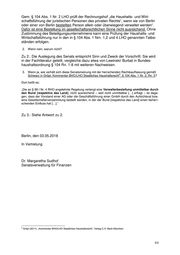 Gem. § 104 Abs. 1 Nr. 2 LHO prüft der Rechnungshof „die Haushalts- und Wirt- schaftsführung der juristischen Personen des privaten Rechts“, wenn sie von Berlin oder einer von Berlin bestellten Person allein oder überwiegend verwaltet werden“. Dafür ist eine Bestellung im gesellschaftsrechtlichen Sinne nicht ausreichend. Ohne Zustimmung des Beteiligungsunternehmens kann eine Prüfung der Haushalts- und Wirtschaftsführung nur in den in § 104 Abs. 1 Nrn. 1,2 und 4 LHO genannten Tatbe- ständen erfolgen. 2. Wenn nein, warum nicht? Zu 2.: Die Auslegung des Senats entspricht Sinn und Zweck der Vorschrift. Sie wird in der Fachliteratur geteilt, vergleiche dazu etwa von Lewinski/ Burbat in Bundes- haushaltsordnung § 104 Rn. 1-8 mit weiteren Nachweisen. 3. Wenn ja, wie verhält sich diese Senatsmeinung mit der herrschenden Rechtsauffassung gemäß 6 Schwarz in Gröpl, Kommentar BHO/LHO Staatliches Haushaltsrecht , § 104 Abs. 1 Nr. 2, Rn. 5? Dort heißt es: „Die an § 88 I Nr. 4 RHO angelehnte Regelung verlangt eine Verwalterbestellung unmittelbar durch den Bund [respektive das Land]; nicht ausreichend – weil nicht unmittelbar […] erfolgt – ist dage- gen, dass der Vorstand einer AG oder die Geschäftsführung einer GmbH durch den Aufsichtsrat bzw. eine Gesellschafterversammlung bestellt werden, in der der Bund [respektive das Land] einen beherr- schenden Einfluss hat […].“ Zu 3.: Siehe Antwort zu 2. Berlin, den 03.05.2018 In Vertretung Dr. Margaretha Sudhof Senatsverwaltung für Finanzen 6 Gröpl (2011): „Kommentar BHO/LHO Staatliches Haushaltsrecht“, Verlag C.H. Beck München. 3/3