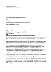Drucksache 18 / 20 472 Schriftliche Anfrage 18. Wahlperiode Schriftliche Anfrage des Abgeordneten Sebastian Czaja (FDP) vom 05. August 2019 (Eingang beim Abgeordnetenhaus am 08. August 2019) zum Thema: Sprachmittler im Landesamt für Flüchtlingsangelegenheiten und Antwort vom 23. August 2019 (Eingang beim Abgeordnetenhaus am 27. August 2019) Die Drucksachen des Abgeordnetenhauses sind bei der Kulturbuch-Verlag GmbH zu beziehen. Hausanschrift: Sprosserweg 3, 12351 Berlin-Buckow · Postanschrift: Postfach 47 04 49, 12313 Berlin, Telefon: 6 61 84 84; Telefax: 6 61 78 28.