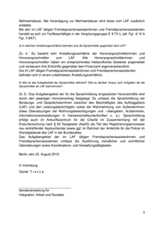 Mehrwertsteuer. Bei Veranlagung zur Mehrwertsteuer wird diese vom LAF zusätzlich erstattet. Bei den im LAF tätigen Fremdsprachenassistentinnen und Fremdsprachenassistenten handelt es sich um Tarifbeschäftigte in der Vergütungsgruppe E 9 TV-L (alt: Fgr. 4/ IV b Fgr. 2 BAT). 4) In welchem Anstellungsverhältnis befinden sich die Sprachmittler gegenüber dem LAF? Zu 4.: Es besteht kein Anstellungsverhältnis der Honorarsprachmttlerinnen und Honorarsprachmittler zum LAF. Alle Honorarsprachmittlerinnen und Honorarsprachmittler haben ein entsprechendes freiberufliches Gewerbe angemeldet und versteuern ihre Einkünfte gegenüber dem Finanzamt eigenverantwortlich. Die im LAF tätigen Fremdsprachenassistentinnen und Fremdsprachenassistenten befinden sich in einem unbefristeten Anstellungsverhältnis. 5) Wie ist das Aufgabenfeld der Sprachmittler definiert? Gibt es darüber hinaus noch Aufgaben die die Sprachmittler am LAF wahrnehmen? Zu 5.: Das Aufgabengebiet der für die Sprachmittlung eingesetzten Honorarkräfte wird durch den jeweiligen Honorarvertrag festgelegt. Es umfasst die Sprachmittlung bei Beratungs- und Gesprächsterminen zwischen den Beschäftigten des Auftraggebers (LAF) und den Leistungsberechtigten sowie die Wahrnehmung von Außenterminen (etwa Übersetzungen bei Wohnungsbesichtigungen und --übergaben, Arztterminen, Informationsveranstaltungen in Gemeinschaftsunterkünften u. a.). Sprachmittlung erfolgt auch im Ankunftszentrum für die Charité im Zusammenhang mit der Erstuntersuchung nach § 62 Asylgesetz (AsylG) als Teil des Registrierungsprozesses neu eintreffender Asylsuchender sowie ggf. im Rahmen der Amtshilfe für die Polizei im Dienstgebäude des LAF in der Bundesallee. Das Aufgabengebiet der im LAF tätigen Fremdsprachenassistentinnen und Fremdsprachenassistenten umfasst die Ausführung mündlicher und schriftlicher Übersetzungen sowie Koordinations- und Verwaltungstätigkeiten. Berlin, den 23. August 2019 In Vertretung Daniel T i e t z e _____________________________ Senatsverwaltung für Integration, Arbeit und Soziales 3