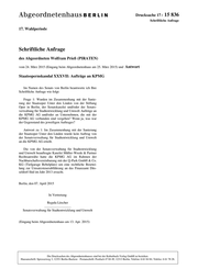 Drucksache 17 / 15 836 Schriftliche Anfrage 17. Wahlperiode Schriftliche Anfrage des Abgeordneten Wolfram Prieß (PIRATEN) vom 24. März 2015 (Eingang beim Abgeordnetenhaus am 25. März 2015) und Antwort Staatsopernskandal XXXVII: Aufträge an KPMG Im Namen des Senats von Berlin beantworte ich Ihre Schriftliche Anfrage wie folgt: Frage 1: Wurden im Zusammenhang mit der Sanie- rung der Staatsoper Unter den Linden von der Stiftung Oper in Berlin, der Senatskanzlei und/oder der Senats- verwaltung für Stadtentwicklung und Umwelt Aufträge an die KPMG AG und/oder an Unternehmen, die mit der KPMG AG verbunden sind vergeben? Wenn ja, was war der Gegenstand des jeweiligen Auftrages? Antwort zu 1: Im Zusammenhang mit der Sanierung der Staatsoper Unter den Linden wurde kein Auftrag von der Senatsverwaltung für Stadtentwicklung und Umwelt an die KPMG AG erteilt. Die von der Senatsverwaltung für Stadtentwicklung und Umwelt beauftragte Kanzlei Müller-Wrede & Partner Rechtsanwälte hatte die KPMG AG im Rahmen der Nachbarschaftsvereinbarung mit der Q-Park GmbH & Co. KG (Tiefgarage Bebelplatz) um eine rechtliche Beurtei- lung zur Umsatzsteuerabführung an das Finanzamt Düs- seldorf-Süd im Jahr 2013 ersucht. Berlin, den 07. April 2015 In Vertretung Regula Lüscher ................................ Senatsverwaltung für Stadtentwicklung und Umwelt (Eingang beim Abgeordnetenhaus am 13. Apr. 2015) Die Drucksachen des Abgeordnetenhauses sind bei der Kulturbuch-Verlag GmbH zu beziehen. Hausanschrift: Sprosserweg 3, 12351 Berlin-Buckow · Postanschrift: Postfach 47 04 49, 12313 Berlin, Telefon: 6 61 84 84; Telefax: 6 61 78 28.