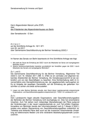 Drucksache 18 / 11 871 Schriftliche Anfrage 18. Wahlperiode Schriftliche Anfrage des Abgeordneten Marcel Luthe (FDP) vom 20. Juli 2017 (Eingang beim Abgeordnetenhaus am 21. Juli 2017) zum Thema: Gemeinsame Geschäftsordnung für die Berliner Verwaltung (GGO) I und Antwort vom 01. August 2017 (Eingang beim Abgeordnetenhaus am 03. Aug. 2017) Die Drucksachen des Abgeordnetenhauses sind bei der Kulturbuch-Verlag GmbH zu beziehen. Hausanschrift: Sprosserweg 3, 12351 Berlin-Buckow · Postanschrift: Postfach 47 04 49, 12313 Berlin, Telefon: 6 61 84 84; Telefax: 6 61 78 28.