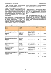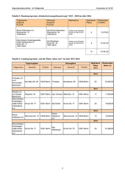 Abgeordnetenhaus Berlin – 18. Wahlperiode Drucksache 18 / 10 767 3. Wie bewertet der Senat die Versorgungssituation serve. Die Bezirksregion hat nur geringfügig mehr ange- mit Kitaplätzen in der BZR Schillerpromenade? botene Betreuungsplätze als betreute Kinder. Zu 3.: Der aktualisierte Förderatlas 2017 identifiziert den Förderbedarf auf der Ebene der Berliner Bezirksregionen 4. Wie hoch waren die Mittel welcher EU-, Bundes- anhand der aktuellen Versorgungssituation zum 30. Juni und/oder Landesprogramme, die jeweils in den einzelnen 2016 sowie der prognostischen Bevölkerungsentwicklung Jahren 2012-2016 in welche Maßnahmen zum Ausbau der gemäß der mittleren Einwohnerprognose bis 2017. Er Kitaplätze in der BZR Schillerpromenade eingesetzt wur- bildet damit die Grundlage für Entscheidungen zur Förde- den? rung eines weiteren, bedarfsgerechten Ausbaus der Kin- dertagesbetreuung. Zu 4.: Den folgenden Tabellen 4 und 5 sind die in den Jahren 2012 - 2016 im Bundesprogramm „Kinderbetreu- Gemäß dem Förderatlas 2017 wird der Platzausbau in der ungsfinanzierung“ und in der Tabelle 6 die im Landes- Bezirksregion Schillerpromenade als prioritär eingestuft. programm „Auf die Plätze Kitas, los!“ bewilligten För- Die Einordnung der Bezirksregion zu Kategorie 3 ver- dermittel für die Bezirksregion Schillerpromenade zu weist auf einen Ausbaubedarf an Plätzen in der Kinderta- entnehmen. gesbetreuung u. a. aufgrund des prognostizierten Anstiegs der Kinderzahlen und der derzeit noch geringen Platzre- Tabelle 4: Bundesprogramm „Kinderbetreuungsfinanzierung“ 2008 - 2013 und 2013 – 2014 Trägername Kitaname Maßnahme Geförderte Fördermittel Anschrift Anschrift Plätze in EURO PLZ/Ort PLZ/Ort Die Globale e. V. Ländliche, urbane und Umbau und Ausstattung kosmopolitische Projekte für Berlin und Kita "Columbus" bestehender sowie neu angemieteter Räume und Brandenburg Weisestr. 26 Außenspielgeräte für eine 17 17.184,00 Falkstr. 24 12049 Berlin Kita mit Betreuung unter 3- 12053 Berlin Jähriger (U3-Anteil) Die Globale e. V. Ländliche, urbane und kosmopolitische Projekte für Berlin und Kita Columbus Umbau von Räumen zur Brandenburg Allerstr. 37 Kita mit U3-Nutzung 8 40.000,00 Falkstr. 24 12049 Berlin 12053 Berlin EKT Kolibri Interkulturell e.V. Kita Kolibri Umbau und Ausstattung Emser Str. 77 Emser Str. 77 einer neu gegründeten Kita 9 28.265,00 12051 Berlin 12051 Berlin mit U3-Anteil Kindertagesstätten SüdOst Umbau der Sanitärräume Kita Wissmannstraße und Garderoben für Krip- Eigenbetrieb von Berlin Wissmannstr. 31 penkinder in einer beste- 60 144.373,00 Neue Krugallee 4 henden Einrichtung zur 12049 Berlin 12435 Berlin Existenzsicherung Morgenwerkstatt gemeinnützige UG mit Kindertagesstätte "Nägel und beschränkter Haftung Köpfe" Umbau einer Ladenwoh- nung zur Kita 7 17.972,00 Reginhardstr. 5 d Emser Str. 85 13409 Berlin 12051 Berlin 101 247.794,00 4