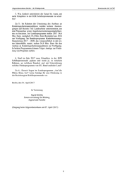 Abgeordnetenhaus Berlin – 18. Wahlperiode Drucksache 18 / 10 767 5. Was konkret unternimmt der Senat bis wann, um mehr Kitaplätze in der BZR Schillerpromenade zu schaf- fen? Zu 5.: Im Rahmen der Umsetzung des Ausbaus an Kindertagesbetreuungsplätzen werden weitere Anstren- gungen auf Bezirks- wie Landesebene unternommen, um den Platzausbau sowie Angebotserweiterungsmöglichkei- ten zu forcieren. Im Landesprogramm stehen 2017 36,6 Mio. Euro, zuzüglich 19,4 Mio. Euro Restmittel aus 2016 zur Verfügung. Im Bundesprogramm Kinderbetreuungs- finanzierung 2017 – 2020, das voraussichtlich in der ers- ten Jahreshälfte startet, stehen 54,9 Mio. Euro für den Ausbau an Kindertagesbetreuungsplätzen zur Verfügung. In beiden Programmen können Träger Anträge zur Förde- rung von Projekten stellen. 6. Sind im Jahr 2017 neue Kitaplätze in der BZR Schillerpromenade geplant und wenn ja, in welchem Rahmen, an welchem Standort und mit Unterstützung welches Förderprogramms von EU, Bund und/oder Land? Zu 6.: Derzeit liegen im Landesprogramm „Auf die Plätze, Kitas, los!“ keine Anträge für eine Förderung in der Bezirksregion Schillerpromenade vor. Berlin, den 01. April 2017 In Vertretung Sigrid Klebba Senatsverwaltung für Bildung, Jugend und Familie (Eingang beim Abgeordnetenhaus am 07. April 2017) 6