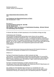Senatsverwaltung für Umwelt, Verkehr und Klimaschutz Herrn Abgeordneten Bernd Schlömer (FDP) über den Präsidenten des Abgeordnetenhauses von Berlin über Senatskanzlei - G Sen - Antwort auf die Schriftliche Anfrage Nr. 18/21460 vom 28. Oktober 2019 über Arbeiten, Leben und Wohnen in Friedrichshain-Kreuzberg – Mit dem Fahrrad von Schöneberg nach Kreuzberg Im Namen des Senats von Berlin beantworte ich Ihre Schriftliche Anfrage wie folgt: Vorbemerkung der Verwaltung: Die Schriftliche Anfrage betrifft Sachverhalte, die der Senat nicht aus eigener Zuständigkeit und Kenntnis beantworten kann. Er ist gleichwohl bemüht, Ihnen eine Antwort auf Ihre Anfrage zukommen zu lassen und hat daher die Bezirke Friedrichshain- Kreuzberg von Berlin und Tempelhof-Schöneberg von Berlin jeweils um Stellungnahme gebeten, die von dort in eigener Verantwortung erstellt und dem Senat übermittelt wurden. Diese werden in der Antwort an den entsprechend gekennzeichneten Stellen wiedergegeben. Frage 1: Welchen aktuellen Stand hat die Umsetzung eines Beschlusses der BVV Tempelhof-Schöneberg zur Einrichtung einer Fahrradstraße vom Kleistpark bis hin zur Kreuzbergstraße? Antwort zu 1: Der Bezirk Friedrichhain-Kreuzberg von Berlin antwortet wie folgt: „Dem Straßen- und Grünflächenamt Friedrichshain-Kreuzberg (SGA F-K) ist der BVV- Beschluss aus Tempelhof-Schöneberg bisher nicht bekannt gewesen. Gerne bietet das SGA F-K seine Unterstützung an. Die restlichen Fragen müsste das Bezirksamt (BA) Tempelhof-Schöneberg beantworten.“ Der Bezirk Tempelhof-Schöneberg von Berlin antwortet wie folgt: „Es überrascht, warum der Senat bezüglich der Umsetzung eines BVV-Beschlusses vom 19.06.2019 durch das Bezirksamt angefragt wird. Der Leitfaden für Fahrradstraßen liegt im Entwurf vor und befindet sich in der Behördenabstimmung. Nach Durchsicht des Entwurfs zeichnet sich ab, dass für eine rechtssichere Planung und Umsetzung einer Fahrradstraße gemäß BVV Tempelhof- 1