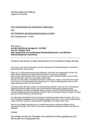 Senatsverwaltung für Bildung, Jugend und Familie Herrn Abgeordneten Kay Nerstheimer (fraktionslos) über den Präsidenten des Abgeordnetenhauses von Berlin über Senatskanzlei - G Sen - Antwort auf die Schriftliche Anfrage Nr. 18/16631 vom 01. Oktober 2018 über Geschichte und Leidensweg Russlanddeutscher in die Berliner Geschichtsbücher aufnehmen ___________________________________________________________________ Im Namen des Senats von Berlin beantworte ich Ihre Schriftliche Anfrage wie folgt: Ist es nicht an der Zeit, die Geschichte und den Leidensweg der Russlanddeutschen in die Berliner Geschichtsbücher aufzunehmen? Schon im 12. Jahrhundert sind die ersten Kaufleute in die Kiewer Rus eingewandert und ab 1764 haben Werber Katharina der Großen deutsche Siedler im Zarenreich angesiedelt. Aber auch der österreichische Kaiser warb in dieser Zeit massiv deutsche Siedler in das Kronland Galizien/Wolhynien, welches in der heutigen Ukraine liegt. Ziel war es in allen Fällen, wirtschaftlich schwache Landstriche zu stärken. Diese Menschen trugen durch ihre Tat- und Schaffenskraft über Generationen zur Völkerverständigung bei sowie zu einer engen Bindung der alten und neuen Heimat. Und gerade diese Menschen wurden für Hitlerdeutschland bestraft, in dem sie ihre in Generationen aufgebaute Heimat komplett verloren oder unmenschlichen Repressalien ausgesetzt waren. Diese Landsleute, die Hitler nicht gewählt haben, obwohl sie zwar die Deutsche Nationalität, aber nicht die Staatsbürgerschaft Deutschlands besaßen, haben am härtesten bezahlen müssen, für etwas, das nicht in ihrem Ermessen und Einfluss lag. Ich finde, dieses Vermächtnis muss den jüngeren Generationen wieder bekannt werden, denn es ist eine anfängliche Erfolgsgeschichte wie Integration gelebt werden kann und zu einem prosperierenden Leben und Wirken zwischen unterschiedlichen Mentalitäten und Völkern führen kann. Aber auch die spätere Vertreibung bzw. Unterdrückung sollte als mahnendes Beispiel nicht in Vergessenheit geraten. Denn Fleiß und der daraus erwachsene Wohlstand schaffen auch Neid und Missgunst. Antwort: Die Anfrage hat eher den Charakter einer persönlichen Meinungsäußerung. Der Senat stellt zum Eingangssatz fest: