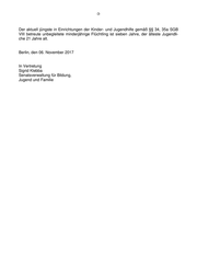 -3- Der aktuell jüngste in Einrichtungen der Kinder- und Jugendhilfe gemäß §§ 34, 35a SGB VIII betreute unbegleitete minderjährige Flüchtling ist sieben Jahre, der älteste Jugendli- che 21 Jahre alt. Berlin, den 06. November 2017 In Vertretung Sigrid Klebba Senatsverwaltung für Bildung, Jugend und Familie