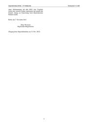 Drucksache 17 / 11 062 Kleine Anfrage 17. Wahlperiode Kleine Anfrage der Abgeordneten Jutta Matuschek (LINKE) vom 08. Oktober 2012 (Eingang beim Abgeordnetenhaus am 11. Oktober 2012) und Antwort Baustopps auf der Baustelle des BER Im Namen des Senats von Berlin beantworte ich Ihre Antwort zu Frage 2: siehe Antwort zu Frage 1 Kleine Anfrage wie folgt: Die Beantwortung beruht teilweise auf Angaben der Frage 3: Wann wurden die jeweiligen Baustopps auf- Flughafen Berlin Brandenburg GmbH (FBB). gehoben, ggf. mit welchen Auflagen? Frage 1: Wann und aus welchem Grund wurden in den Antwort zu Frage 3: Die Aufhebung der Baustopps an Jahren 2010, 2011 und 2012 Baustopps auf der Baustelle die ausführenden Firmen erfolgte durch die FBB des BER durch wen angeordnet? sukzessive mit Fertigstellung der Planungen in den von den Baustopps betroffenen Bereichen in der Terminal- Antwort zu Frage 1: halle ab März 2011. Mitte Juli 2011 wurde der vorübergehende Betonier- Jahr 2010 stopp aufgehoben. Die Ausführung des Schutzbetons er- Zur Umsetzung neuer EU-Sicherheitsvorschriften folgte nach Freigabe der Genehmigungsbehörde an- mussten durch die FBB für die in der Terminalhalle be- schließend in Leichtbeton. troffenen Umplanungsbereiche Baustopps ausgesprochen Mit Abweichungsbescheid von Anfang Juli 2012 hat werden. das BOA den Einbau der Brandschutzklappen bewilligt. Für die Stahlblechkanäle und Feuerschutzvorhänge liegen Jahr 2011 derzeit noch keine Abweichungsbescheide seitens des BOA vor. Zum damaligen Zeitpunkt (Januar/Februar Durch die FBB erfolgte Anfang Juli 2011 gegenüber 2012) wurde davon ausgegangen, dass in Verbindung mit dem Generalunternehmer (GU XX - Frei- und Grün- dem Verfahrensbeginn zur Erlangung der Zustimmungen flächen) die Anordnung eines vorübergehenden Betonier- im Einzelfall die Bewilligung rechtzeitig vor Inbetrieb- stopps im Bereich der Airport-City Plaza. Anstatt des nahme vorliegt. vorgesehenen Normalbetons wurde ein Leichtbeton für die Ausführung von Teilflächen des Schutzbetons auf der Abdichtung der Tunneldecke erforderlich. Frage 4: Wie wirkten sich die Baustopps auf den Mitte November 2011 verhängte das Bauordnungsamt jeweils gültigen Bauablaufplan zur Realisierung des Er- Landkreis Dahme-Spreewald (BOA) einen partiellen öffnungstermins aus? Baustopp für den Einbau der Brandschutzklappen, Stahl- blechkanäle und Feuerschutzvorhänge aufgrund fehlender Antwort zu Frage 4: Die Baustopps aufgrund der Um- Verwendbarkeitsnachweise (daraus ergab sich die Er- setzung der neuen EU-Sicherheitsvorschriften wurden in fordernis von Zustimmungen im Einzelfall). den Bauablaufplan integriert; die aus der Umplanung ent- standenen Verzögerungen stellten einen Parameter bei der Jahr 2012 Festlegung des Eröffnungstermins 03.06.2012 dar. Im Jahr 2012 wurden auf der Baustelle des BER keine Aus der Behinderung von 5 Tagen im Zuge des Baustopps angeordnet. vorübergehenden Betonierstopps ergaben sich keine Auswirkungen auf die Realisierung des Eröffnungs- termins. Frage 2: Was waren die jeweiligen Gründe für die Die seitens des Bauordnungsamtes ausgesprochenen Anordnung? Baustopps wirkten sich aufgrund des schon fort- geschrittenen Leistungsstandes nicht auf den gültigen Bauablaufplan aus. Auf Basis sofortiger und bis dato Die Drucksachen des Abgeordnetenhauses sind bei der Kulturbuch-Verlag GmbH zu beziehen. Hausanschrift: Sprosserweg 3, 12351 Berlin-Buckow · Postanschrift: Postfach 47 04 49, 12313 Berlin, Telefon: 6 61 84 84; Telefax: 6 61 78 28.