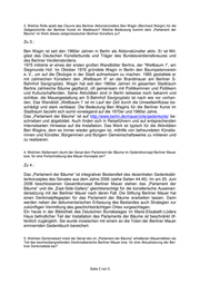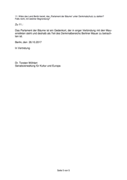 11. Wäre das Land Berlin bereit, das „Parlament der Bäume“ unter Denkmalschutz zu stellen? Falls nicht, mit welcher Begründung? Zu 11.: Das Parlament der Bäume ist ein Gedenkort, der in enger Verbindung mit den Mau- errelikten steht und deshalb als Teil des Denkmalbereichs Berliner Mauer zu betrach- ten ist. Berlin, den 26.10.2017 In Vertretung Dr. Torsten Wöhlert Senatsverwaltung für Kultur und Europa Seite 5 von 5