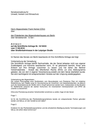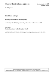 Drucksache 18 / 16 533 Schriftliche Anfrage 18. Wahlperiode Schriftliche Anfrage des Abgeordneten Frank Henkel (CDU) vom 17. September 2018 (Eingang beim Abgeordnetenhaus am 21. September 2018) zum Thema: Straßenbahntrasse in der Leipziger Straße und Antwort vom 07. Oktober 2018 (Eingang beim Abgeordnetenhaus am 11. Okt. 2018) Die Drucksachen des Abgeordnetenhauses sind bei der Kulturbuch-Verlag GmbH zu beziehen. Hausanschrift: Sprosserweg 3, 12351 Berlin-Buckow · Postanschrift: Postfach 47 04 49, 12313 Berlin, Telefon: 6 61 84 84; Telefax: 6 61 78 28.