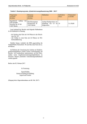 Abgeordnetenhaus Berlin – 18. Wahlperiode Drucksache 18 / 10 323 Tabelle 3: Bundesprogramm „Kinderbetreuungsfinanzierung 2008 – 2013“ Trägername Kitaname Maßnahme Geförderte Fördermittel Anschrift Anschrift Plätze in EURO PLZ/Ort PLZ/Ort Jugendwerk Aufbau Ost Kita Rosengarten Ausbau Dachgeschoss zur JAO gGmbH Pestalozzistr. 29 Schaffung von U3 im 10 31.130,00 Nossener Str. 87-89 12623 Berlin Erdgeschoss 12627 Berlin Laut Auskunft des Bezirks sind folgende Maßnahmen in Alt-Mahlsdorf in Planung: - der Neubau einer Kita mit 164 Plätzen in der Dirsch- auer Str. 107, - der Umbau zu einer Kita mit 26 Plätzen im Wil- helmsmühlenweg. Darüber hinaus veräußert die BIM gegenwärtig die Vorhaltefläche Donizettistr. 50 zum Bau einer Kita mit ca. 60 Plätzen. Im Rahmen der Umsetzung des Ausbaus an Kinderta- gesbetreuungsplätzen werden weitere Anstrengungen auf Bezirks- wie Landesebene unternommen, um den Platz- ausbau sowie Angebotserweiterungsmöglichkeiten zu forcieren. Weitere potentielle Unterstützungsmaßnahmen werden geprüft. Berlin, den 02. Februar 2017 In Vertretung Sigrid Klebba Senatsverwaltung für Bildung, Jugend und Familie (Eingang beim Abgeordnetenhaus am 08. Feb. 2017) 3
