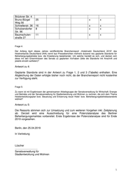 Brückner Str. 4 Bruno-Bürgel 25 x x Weg 56 Schnellerstr. 36 16 x x Schulzendorfer 8 x x Str. 96 Baumschulen- 11 x x straße 27 Frage 4: Der Anfang April dieses Jahres veröffentlichte Branchenreport „Hotelmarkt Deutschland 2019“ des Hotelverbands Deutschland (IHA) nennt laut Presseberichten mehrere dutzend neu geplante Standorte für Beherbergungsbetriebe bzw. die Erweiterung bestehender. Um welche handelt es sich, und decken sich diese mit den Erkenntnissen des Senats zu geplanten Vorhaben (bitte die Standorte mit Anschrift und jeweils einzeln auflisten)? Antwort zu 4: Geplante Standorte sind in der Antwort zu Frage 1, 2 und 3 (Tabelle) enthalten. Eine Abgleichung der Daten erfolgte bisher noch nicht, da der Branchenreport nicht kostenfrei zur Verfügung steht. Frage 5: Zu wann ist mit Ergebnissen der gemeinsamen Arbeitsgruppe der Senatsverwaltung für Wirtschaft, Energie und Betriebe und der Senatsverwaltung für Stadtentwicklung und Wohnen zu rechnen, die sich dem Thema Hotelentwicklungsplan bzw. Steuerung und Entzerrung neuer Hotel- bzw. Beherbergungsbetriebsstandorte widmet? Antwort zu 5: Die Ressorts stimmen sich zur Umsetzung und zum weiteren Vorgehen inkl. Zeitplanung ab. Derzeit wird eine Ausschreibung für eine Potenzialanalyse des Berliner Beherbergungsmarktes vorbereitet. Erste Ergebnisse der Potenzialanalyse sind für Ende 2019 vorgesehen. Berlin, den 25.04.2019 In Vertretung Lüscher ................................ Senatsverwaltung für Stadtentwicklung und Wohnen 5