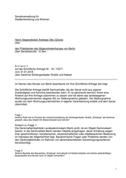 Senatsverwaltung für Stadtentwicklung und Wohnen Herrn Abgeordneten Andreas Otto (Grüne) über den Präsidenten des Abgeordnetenhauses von Berlin über Senatskanzlei - G Sen - Antwort auf die Schriftliche Anfrage Nr. 18 / 13371 vom 31.01.2018 über Denkmal Schlangenbader Straße und Asbest Im Namen des Senats von Berlin beantworte ich Ihre Schriftliche Anfrage wie folgt: Die Schriftliche Anfrage betrifft Sachverhalte, die der Senat nicht aus eigener Zuständigkeit und Kenntnis beantworten kann. Er ist gleichwohl bemüht, Ihnen eine Antwort auf Ihre Anfrage zukommen zu lassen und hat daher das landeseigenen Wohnungsunternehmen degewo AG um Stellungnahme gebeten. Die Stellungnahme wurde von dem Wohnungsunternehmen in eigener Verantwortung erstellt und dem Senat übermittelt. Frage 1: Welche Rolle hat im Prozess der Unterschutzstellung der Schlangenbader Straße „Schlange“ als Denkmal gespielt, dass das Objekt mit Asbest belastet sein könnte? Antwort zu Frage 1: Die Denkmalfachbehörde Landesdenkmalamt Berlin prüft, ob ein Objekt Denkmalwert besitzt. In die Denkmalliste Berlin werden Objekte eingetragen, deren Erhaltung wegen ihrer geschichtlichen, künstlerischen, wissenschaftlichen oder städtebaulichen Bedeutung im Interesse der Allgemeinheit liegt. Bautechnische Fragen oder Probleme werden von den Denkmalbehörden im Rahmen von denkmalrechtlichen Genehmigungsverfahren berücksichtigt. Frage 2: Welche Bauteile des Bauwerkes „Schlange“ sind aktuell mit Asbest belastet und welche asbesthaltigen Bauprodukte sind derzeit noch im Objekt vorhanden? 1