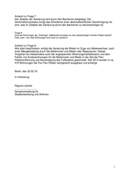 Antwort zu Frage 7: Der Zeitplan der Sanierung wird durch den Bauherren festgelegt. Der Denkmalschutzstatus bringt das Erfordernis einer denkmalrechtlichen Genehmigung mit sich, was im Zeitplan der Sanierung durch den Bauherren zu berücksichtigen ist. Frage 8: Sind die Wohnungen der „Schlange“ mittlerweile komplett von den asbesthaltigen Florflex-Platten befreit? Falls „nein“, wie viele Wohnungen sind noch zu sanieren? Antwort zu Frage 8: Wie oben beschrieben, erfolgt die Sanierung der Böden im Zuge von Mieterwechsel, nach einer Mängelmeldung durch die Mieterinnen und Mieter oder Reparaturen. Dieses Vorgehen ist insbesondere auch der angespannten Wohnungsmarktsituation und dem Fehlen von Ersatzwohnungen für die Mieterinnen und Mieter in der Zeit der Flex- Plattenentfernung und Neuverlegung des Fußbodens geschuldet. Seit 2013 wurden in ca. 470 Wohnungen die Flor-Flex-Platten fachgerecht ausgebaut und entsorgt. Berlin, den 20.02.18 In Vertretung Regula Lüscher ................................ Senatsverwaltung für Stadtentwicklung und Wohnen 3