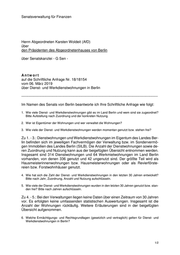 Drucksache 18 / 18 154 Schriftliche Anfrage 18. Wahlperiode Schriftliche Anfrage des Abgeordneten Karsten Woldeit (AfD) vom 06. März 2019 (Eingang beim Abgeordnetenhaus am 07. März 2019) zum Thema: Dienst- und Werkdienstwohnungen in Berlin und Antwort vom 21. März 2019 (Eingang beim Abgeordnetenhaus am 28. Mrz. 2019) Die Drucksachen des Abgeordnetenhauses sind bei der Kulturbuch-Verlag GmbH zu beziehen. Hausanschrift: Sprosserweg 3, 12351 Berlin-Buckow · Postanschrift: Postfach 47 04 49, 12313 Berlin, Telefon: 6 61 84 84; Telefax: 6 61 78 28.