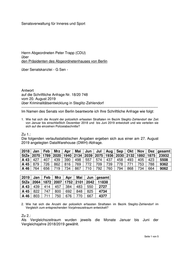 Senatsverwaltung für Inneres und Sport Herrn Abgeordneten Peter Trapp (CDU) über den Präsidenten des Abgeordnetenhauses von Berlin über Senatskanzlei - G Sen - Antwort auf die Schriftliche Anfrage Nr. 18/20 748 vom 20. August 2019 über Kriminalitätsentwicklung in Steglitz-Zehlendorf ----------------------------------------------------------------------------------------------------------------- Im Namen des Senats von Berlin beantworte ich Ihre Schriftliche Anfrage wie folgt: 1. Wie hat sich die Anzahl der polizeilich erfassten Straftaten im Bezirk Steglitz-Zehlendorf der Zeit von Januar bis einschließlich Dezember 2018 und bis Juni 2019 entwickelt und wie verteilen sie sich auf die einzelnen Polizeiabschnitte? Zu 1.: Die folgenden verlaufsstatistischen Angaben ergeben sich aus einer am 27. August 2019 angelegten DataWarehouse (DWH)-Abfrage. 2018 Jan Feb Mrz Apr Mai Jun Jul Aug Sep Okt Nov Dez gesamt StZe 2070 1789 2020 1940 2134 2039 2075 1936 2030 2132 1892 1875 23932 A 43 427 407 439 390 498 557 574 437 458 493 405 423 5508 A 45 879 726 862 816 769 772 709 739 778 771 753 788 9362 A 46 764 656 719 734 867 710 792 760 794 868 734 664 9062 2019 Jan Feb Mrz Apr Mai Jun gesamt StZe 2064 1872 2007 1752 2101 2042 11838 A 43 439 414 457 384 483 550 2727 A 45 822 747 800 692 848 825 4734 A 46 803 711 750 676 770 667 4377 2. Wie hat sich die Anzahl der polizeilich erfassten Straftaten im Bezirk Steglitz-Zehlendorf im Vergleich zum entsprechenden Vorjahreszeitraum entwickelt? Zu 2.: Als Vergleichszeitraum wurden jeweils die Monate Januar bis Juni der Vergleichsjahre 2018/2019 gewählt. Seite 1 von 5