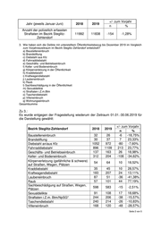 +/- zum Vorjahr Jahr (jeweils Januar-Juni) 2018 2019 n % Anzahl der polizeilich erfassten Straftaten im Bezirk Steglitz- 11992 11838 -154 -1,28% Zehlendorf 3. Wie haben sich die Delikte mit unterstelltem Öffentlichkeitsbezug bis Dezember 2019 im Vergleich zum Vorjahreszeitraum im Bezirk Steglitz-Zehlendorf entwickelt? a) Baustelleneinbruch b) Brandstiftung c) Diebstahl aus Kfz d) Fahrraddiebstahl e) Geschäfts- und Betriebseinbruch f) Keller -und Bodeneinbruch g) Körperverletzung in der Öffentlichkeit h) Kraddiebstahl i) Kraftwagendiebstahl j) Laubeneinbruch k) Raub l) Sachbeschädigung in der Öffentlichkeit m) Sexualdelikte n) Straftaten i.Z.m.Btm o) Taschendiebstahl p) Villeneinbruch q) Wohnungseinbruch Gesamtsumme Zu 3.: Es wurde entgegen der Fragestellung wiederum der Zeitraum 01.01.-30.06.2019 für die Darstellung gewählt: +/- zum Vorjahr Bezirk Steglitz-Zehlendorf 2018 2019 n % Baustelleneinbruch 32 26 -6 -18,75% Brandstiftung 30 37 7 23,33% Diebstahl an/aus Kfz 1052 972 -80 -7,60% Fahrraddiebstahl 896 1109 213 23,77% Geschäfts- und Betriebseinbruch 137 163 26 18,98% Keller- und Bodeneinbruch 312 204 -108 -34,62% Körperverletzung (gefährliche & schwere) 54 64 10 18,52% auf Straßen, Wegen, Plätzen Kraddiebstahl 35 45 10 28,57% Kraftwagendiebstahl 183 207 24 13,11% Laubeneinbruch 87 51 -36 -41,38% Raub 57 101 44 77,19% Sachbeschädigung auf Straßen, Wegen, 598 583 -15 -2,51% Plätzen Sexualdelikte 91 108 17 18,68% Straftaten i.Z.m. Btm/NpSG* 244 206 -38 -15,57% Taschendiebstahl 240 214 -26 -10,83% Villeneinbruch 168 120 -48 -28,57% Seite 2 von 5