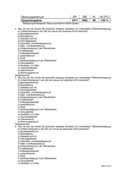 Wohnungseinbruch 201 292 91 45,27% Gesamtergebnis 4417 4502 85 1,92 % *Betäubungsmittelgesetz/ Neue-psychoaktive-Stoffe-Gesetz 4. Wie hat sich die Anzahl der polizeilich erfassten Straftaten mit unterstelltem Öffentlichkeitsbezug im Ortsteil Wannsee in der Zeit von Januar bis Dezember 2019 entwickelt? a) Baustelleneinbruch b) Brandstiftung c) Diebstahl aus Kfz d) Fahrraddiebstahl e) Geschäfts- und Betriebseinbruch f) Keller -und Bodeneinbruch g) Körperverletzung in der Öffentlichkeit h) Kraddiebstahl i) Kraftwagendiebstahl j) Laubeneinbruch k) Raub l) Sachbeschädigung in der Öffentlichkeit m) Sexualdelikte n) Straftaten i.Z.m.Btm o) Taschendiebstahl p) Villeneinbruch q) Wohnungseinbruch Gesamtsumme 5. Wie hat sich die Anzahl der polizeilich erfassten Straftaten mit unterstelltem Öffentlichkeitsbezug im Ortsteil Nikolassee in der Zeit von Januar bis Dezember 2019 entwickelt? a) Baustelleneinbruch b) Brandstiftung c) Diebstahl aus Kfz d) Fahrraddiebstahl e) Geschäfts- und Betriebseinbruch f) Keller -und Bodeneinbruch g) Körperverletzung in der Öffentlichkeit h) Kraddiebstahl i) Kraftwagendiebstahl j) Laubeneinbruch k) Raub l) Sachbeschädigung in der Öffentlichkeit m) Sexualdelikte n) Straftaten i.Z.m.Btm o) Taschendiebstahl p) Villeneinbruch q) Wohnungseinbruch Gesamtsumme 6. Wie hat sich die Anzahl der polizeilich erfassten Straftaten mit unterstelltem Öffentlichkeitsbezug im Ortsteil Zehlendorf in der Zeit von Januar bis Dezember 2019 entwickelt? a) Baustelleneinbruch b) Brandstiftung c) Diebstahl aus Kfz d) Fahrraddiebstahl e) Geschäfts- und Betriebseinbruch f) Keller -und Bodeneinbruch g) Körperverletzung in der Öffentlichkeit h) Kraddiebstahl i) Kraftwagendiebstahl j) Laubeneinbruch k) Raub l) Sachbeschädigung in der Öffentlichkeit m) Sexualdelikte n) Straftaten i.Z.m.Btm Seite 3 von 5