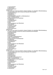 o) Taschendiebstahl p) Villeneinbruch q) Wohnungseinbruch Gesamtsumme 7. Wie hat sich die Anzahl der polizeilich erfassten Straftaten mit unterstelltem Öffentlichkeitsbezug im Ortsteil Dahlem in der Zeit von Januar bis Dezember 2019 entwickelt? a) Baustelleneinbruch b) Brandstiftung c) Diebstahl aus Kfz d) Fahrraddiebstahl e) Geschäfts- und Betriebseinbruch f) Keller -und Bodeneinbruch g) Körperverletzung in der Öffentlichkeit h) Kraddiebstahl i) Kraftwagendiebstahl j) Laubeneinbruch k) Raub l) Sachbeschädigung in der Öffentlichkeit m) Sexualdelikte n) Straftaten i.Z.m.Btm o) Taschendiebstahl p) Villeneinbruch q) Wohnungseinbruch Gesamtsumme 8. Wie hat sich die Anzahl der polizeilich erfassten Straftaten mit unterstelltem Öffentlichkeitsbezug im Ortsteil Lichterfelde in der Zeit von Januar bis Dezember 2019 entwickelt? a) Baustelleneinbruch b) Brandstiftung c) Diebstahl aus Kfz d) Fahrraddiebstahl e) Geschäfts- und Betriebseinbruch f) Keller -und Bodeneinbruch g) Körperverletzung in der Öffentlichkeit h) Kraddiebstahl i) Kraftwagendiebstahl j) Laubeneinbruch k) Raub l) Sachbeschädigung in der Öffentlichkeit m) Sexualdelikte n) Straftaten i.Z.m.Btm o) Taschendiebstahl p) Villeneinbruch q) Wohnungseinbruch Gesamtsumme 9. Wie hat sich die Anzahl der polizeilich erfassten Straftaten mit unterstelltem Öffentlichkeitsbezug im Ortsteil Steglitz in der Zeit von Januar bis Dezember 2019 entwickelt? a) Baustelleneinbruch b) Brandstiftung c) Diebstahl aus Kfz d) Fahrraddiebstahl e) Geschäfts- und Betriebseinbruch f) Keller -und Bodeneinbruch g) Körperverletzung in der Öffentlichkeit h) Kraddiebstahl i) Kraftwagendiebstahl j) Laubeneinbruch k) Raub l) Sachbeschädigung in der Öffentlichkeit m) Sexualdelikte n) Straftaten i.Z.m.Btm o) Taschendiebstahl p) Villeneinbruch Seite 4 von 5