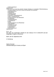 q) Wohnungseinbruch Gesamtsumme 10. Wie hat sich die Anzahl der polizeilich erfassten Straftaten mit unterstelltem Öffentlichkeitsbezug im Ortsteil Lankwitz in der Zeit von Januar bis Dezember 2019 entwickelt? a) Baustelleneinbruch b) Brandstiftung c) Diebstahl aus Kfz d) Fahrraddiebstahl e) Geschäfts- und Betriebseinbruch f) Keller -und Bodeneinbruch g) Körperverletzung in der Öffentlichkeit h) Kraddiebstahl i) Kraftwagendiebstahl j) Laubeneinbruch k) Raub l) Sachbeschädigung in der Öffentlichkeit m) Sexualdelikte n) Straftaten i.Z.m.Btm o) Taschendiebstahl p) Villeneinbruch q) Wohnungseinbruch Gesamtsumme Zu 4. - 10.: Die Daten der angefragten Ortsteile für den Zeitraum 01.01.-30.06.2019 sind der beigefügten Anlage zu entnehmen. Berlin, den 03. September 2019 In Vertretung Sabine Smentek Senatsverwaltung für Inneres und Sport Seite 5 von 5
