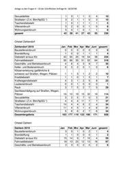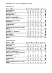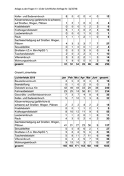 Anlage zu den Fragen 4 – 10 der Schriftlichen Anfrage Nr. 18/20748 Ortsteil Steglitz Steglitz Jan Feb Mrz Apr Mai Juni gesamt Baustelleneinbruch 0 2 0 2 0 0 4 Brandstiftung 3 1 2 0 5 1 12 Diebstahl an/aus Kfz 43 34 27 28 46 37 215 Fahrraddiebstahl 31 35 53 67 76 69 331 Geschäfts- und Betriebseinbruch 8 4 12 7 10 14 55 Keller- und Bodeneinbruch 14 14 14 6 11 36 95 Körperverletzung (gefährliche & schwere) auf Straßen, Wegen, Plätzen 4 3 6 3 1 4 21 Kraddiebstahl 2 3 3 4 5 4 21 Kraftwagendiebstahl 11 12 15 14 12 7 71 Laubeneinbruch 1 1 0 0 0 2 4 Raub 7 5 9 3 6 4 34 Sachbeschädigung auf Straßen, Wegen, Plätzen 35 22 23 18 33 18 149 Sexualdelikte 5 7 5 5 3 3 28 Straftaten i.Z.m. Btm/NpSG *) 10 12 16 8 11 13 70 Taschendiebstahl 15 21 14 9 15 19 93 Villeneinbruch 0 0 1 0 1 0 2 Wohnungseinbruch 22 11 9 14 21 23 100 gesamt 211 187 209 188 256 254 1305 Ortsteil Lankwitz Lankwitz Jan Feb Mrz Apr Mai Juni gesamt Baustelleneinbruch 0 0 0 0 0 1 1 Brandstiftung 0 0 0 0 0 1 1 Diebstahl an/aus Kfz 16 33 23 18 21 19 130 Fahrraddiebstahl 4 4 10 9 11 4 42 Geschäfts- und Betriebseinbruch 2 1 3 7 0 4 17 Keller- und Bodeneinbruch 4 15 19 13 0 4 55 Körperverletzung (gefährliche & schwere) auf Straßen, Wegen, Plätzen 0 0 0 3 4 1 8 Kraddiebstahl 0 0 1 1 1 0 3 Kraftwagendiebstahl 1 5 4 3 4 2 19 Laubeneinbruch 8 0 12 0 14 0 34 Raub 1 1 2 1 1 0 6
