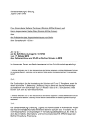 Senatsverwaltung für Bildung, Jugend und Familie Frau Abgeordnete Stefanie Remlinger (Bündnis 90/Die Grünen) und Herrn Abgeordneten Stefan Ziller (Bündnis 90/Die Grünen) über den Präsidenten des Abgeordnetenhauses von Berlin über Senatskanzlei - G Sen - Antwort auf die Schriftliche Anfrage Nr. 18/16768 vom 17. Oktober 2018 über Netzanschlüsse und WLAN an Berliner Schulen in 2018 ___________________________________________________________________ Im Namen des Senats von Berlin beantworte ich Ihre Schriftliche Anfrage wie folgt: 1. Welche Behörden sind für den Netzanschluss der Berliner allgemein- und berufsbildenden Schulen im edukativen Bereich zuständig und bei welcher Stelle werden die diesbezüglichen Vorgänge bear- beitet? Zu 1.: Die Zuständigkeit für die Ausstattung der Schulen mit IT und IT-Peripherie sowie für deren technische IT-Betreuung („Wartung“) liegt in Berlin als Sachaufwandsträger grundsätzlich beim Schulträger (vgl. § 7 Absatz 5 Satz 2 Nr. 2 Schulgesetz). Dies bezieht sich auch auf den Netzanschluss. 2. Welche Behörden sind für den Netzanschluss der Berliner allgemein- und berufsbildenden Schulen im administrativen Bereich zuständig und bei welcher Stelle werden die diesbezüglichen Vorgänge bearbeitet? Zu 2.: Die Senatsverwaltung für Bildung, Jugend und Familie stattet im Rahmen des Projek- tes eGovernment@School alle öffentlichen Berliner Schulen über T-Systems mit ei- nem Netzanschluss für die jeweiligen IT-Verwaltungsarbeitsplätze aus. Es findet zu- dem die einheitliche Informations- und Kommunikationstechnik (IKT)-Strategie der Berliner Verwaltung Anwendung.